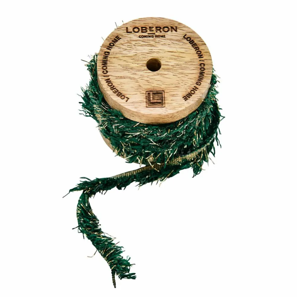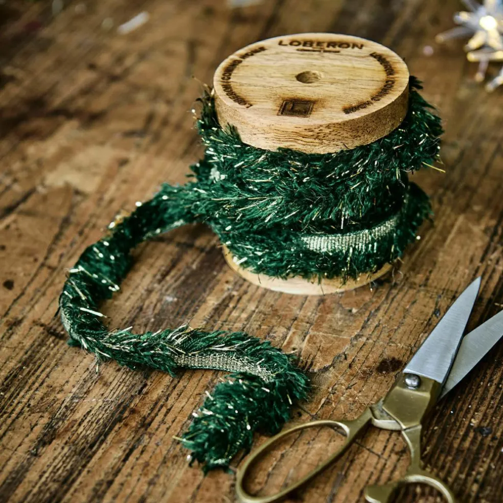 Ein Band wie geschaffen für festliche Momente: Funkelnde, goldene Farbe schimmert neben tiefem Tannengrün – als wäre ein Hauch Winterwald in Sternenlicht getaucht. Die üppige Fransenkante bringt Bewegung und Textur ins Spiel, während der stabile Mittelstreifen Ihre Dekorationen stilvoll zusammenhält. Ob zum Verpacken, Verzieren oder Basteln – dieses Band macht jede kreative Idee zu einem kleinen Fest. Und weil auch das Aufbewahren Freude machen darf, kommt es gewickelt auf einer hochwertigen Spule aus Mangoholz – fast zu schade für die Schublade.