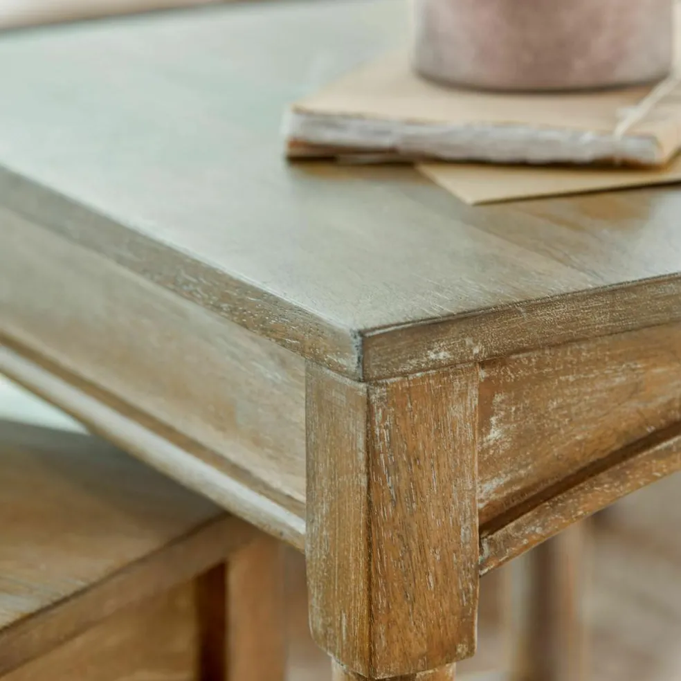 Dieses 2er-Set Beistelltische bringt den rustikalen Charme robusten Mangoholzes in Ihr Zuhause. Mit einem dezenten White-Washed-Finish versehen, strahlen die Tische eine warme, zeitlose Eleganz aus, die sich nahtlos in moderne wie klassische Umgebungen einfügt. Der kleinere Tisch kann platzsparend unter den größeren geschoben werden, was das Set ideal für kleine Räume oder als flexible Ablageflächen macht. Die klare, schlichte Formgebung der Tische betont die natürliche Maserung des Holzes und sorgt für eine angenehme Haptik. Ob als praktische Ergänzung im Wohnzimmer oder als kreative Ablage im Schlafzimmer, dieses Set bietet vielseitige Möglichkeiten für ein stilvolles und funktionales Ambiente.
