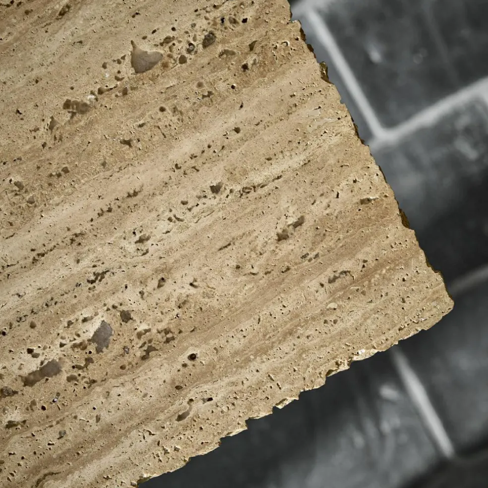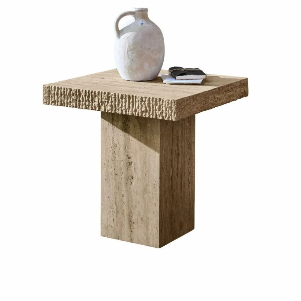 Dieser Beistelltisch bringt die Essenz von Stein und Natur in Ihre Wohnwelt. Gefertigt aus echtem Travertin – einem Naturkalkstein mit jahrtausendealter Geschichte – vereint er ursprüngliche Materialien mit einer klaren, modernen Formensprache. Besonders hervorzuheben ist die stark strukturierte Tischkante, die an grob behauenes Gestein erinnert und dem Tisch eine fast archaische Ausstrahlung verleiht. Der stabile Blockfuß rundet das Design ab und verleiht ihm eine skulpturale Wirkung. Ob als Ergänzung zu einem Couchtisch aus gleichem Material oder als eigenständiger Akzent: Dieser Tisch strahlt Ruhe, Stärke und Natürlichkeit aus.