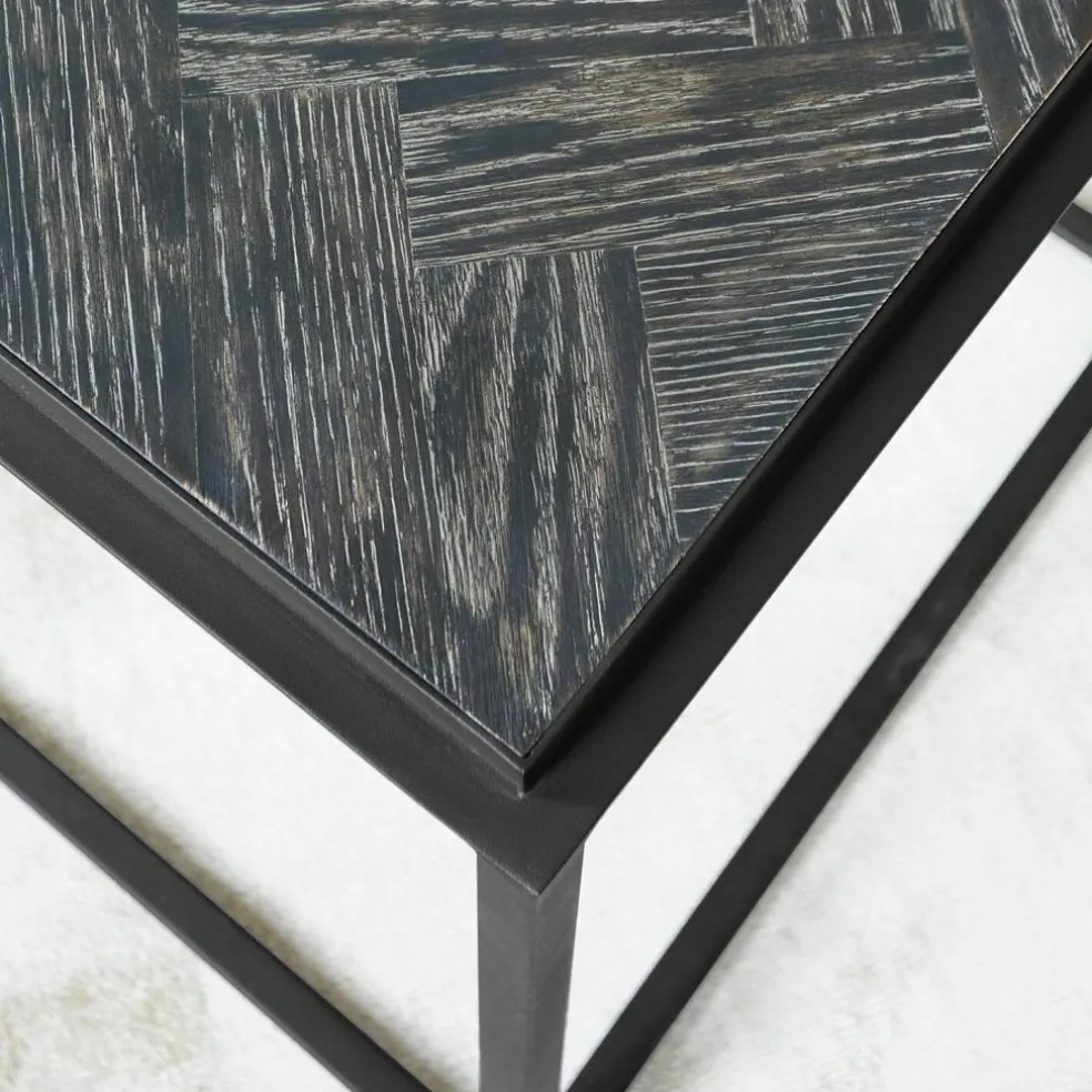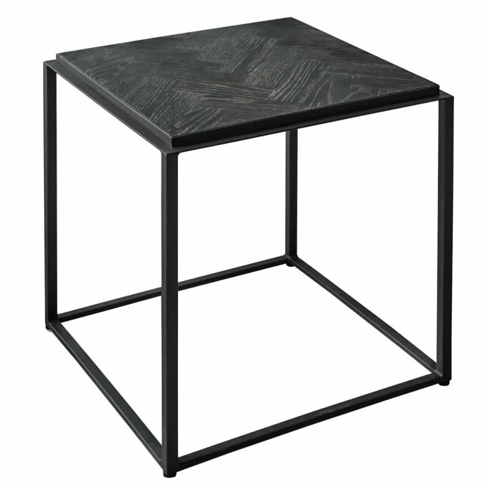 Mit diesem quadratischen Beistelltisch holen Sie sich ein Stück zeitlose Eleganz in Ihr Zuhause. Die stabile Eisenkonstruktion sorgt nicht nur für Langlebigkeit, sondern verleiht dem Tisch auch einen modernen, industriellen Touch. Die Tischplatte aus hochwertigem Eichenholzfurnier besticht durch ein raffiniertes Fischgrätmuster, das die natürliche Schönheit des Holzes unterstreicht. Die sichtbare Holzmaserung bringt Wärme und Natürlichkeit in jeden Raum. Ob als praktischer Ablageort neben Ihrem Sofa, als praktischer Nachttisch neben dem Bett oder als stilvolles Element im Arbeitszimmer – dieser Tisch verbindet Funktionalität und Ästhetik auf beeindruckende Weise.