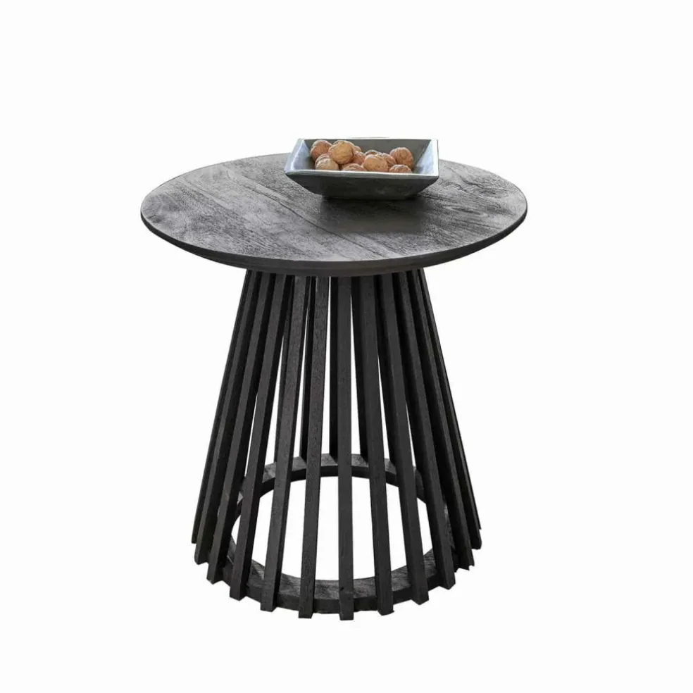 Dieser Beistelltisch ist ein echtes Statement-Piece. Die Kombination aus runder Tischplatte und skulpturalem Gestell verleiht ihm eine außergewöhnliche Präsenz. Das dunkle Holz mit seiner feinen Maserung bringt Tiefe und Wärme in den Raum, während die filigranen, aber stabilen Streben für eine luftige Leichtigkeit sorgen. Ob als Ablage neben dem Sofa, als dekorativer Akzent im Eingangsbereich oder als Nachttisch – dieses Möbelstück überzeugt durch seine Vielseitigkeit und seine ausdrucksstarke Formensprache.