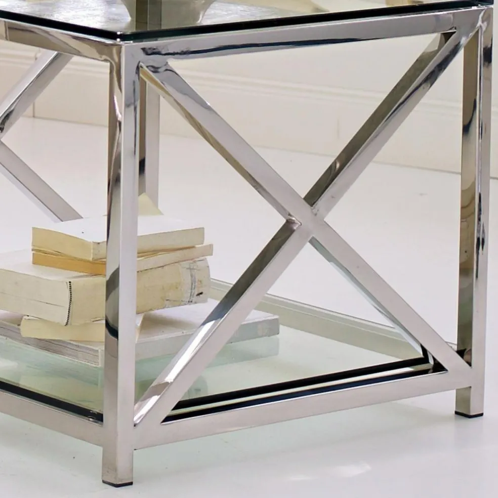 Glas, Edelstahl und ein klares, schlankes Design: Die schlichte Eleganz dieses Beistelltisches ist zeitlos schön. Zwei robuste Glasböden wurden in ein stabiles Metallgestell mit silberfarbenem Finish gearbeitet. Die Kreuzstreben verstärken den klassischen Look. Passt wunderbar zu einem schnörkellosen Ledersofa, sowie auch zu einer Couch im gemütlichen Hussen-Stil. Auch als Couchtisch nutzbar – paarweise setzt der Beistelltisch einen besonders individuellen Akzent.
