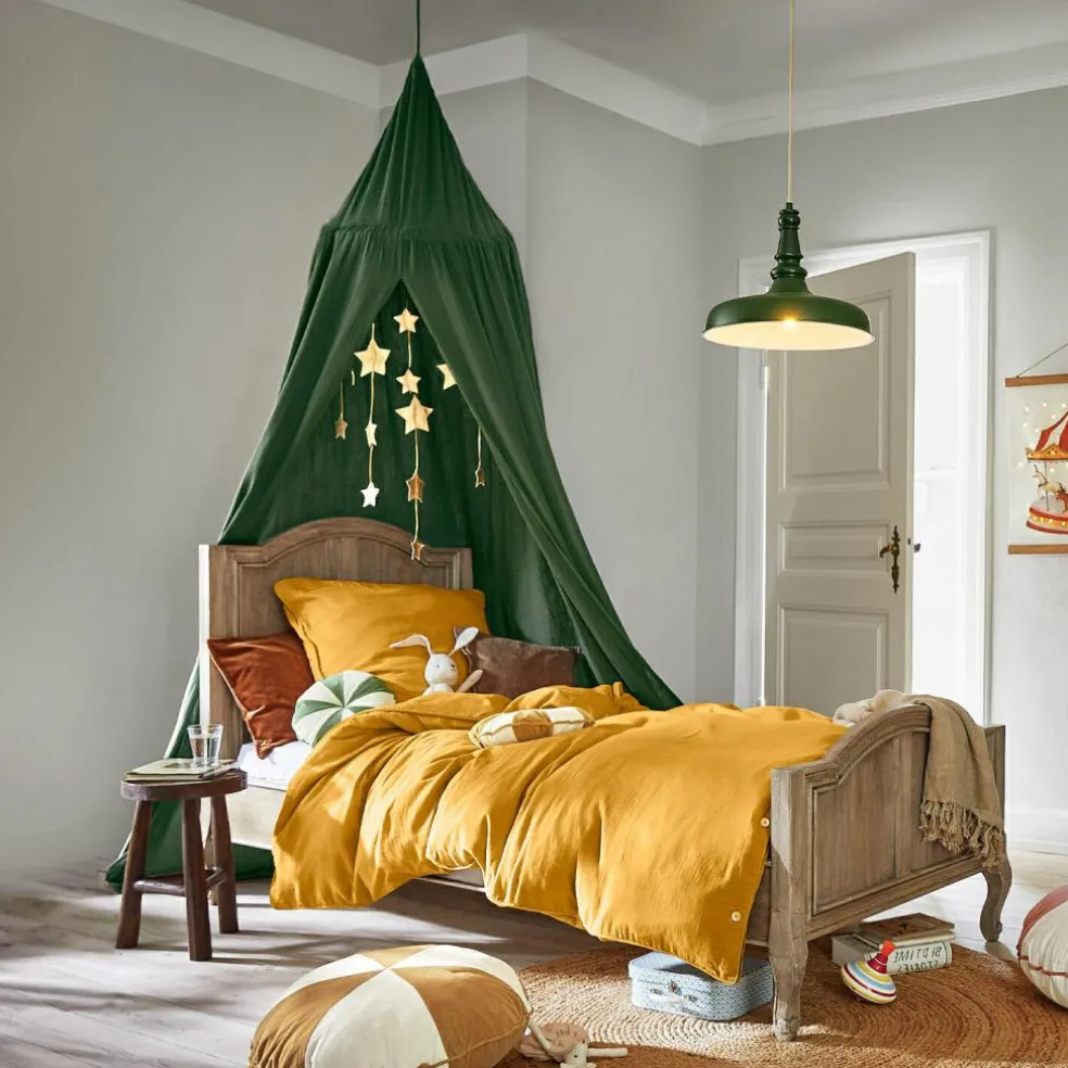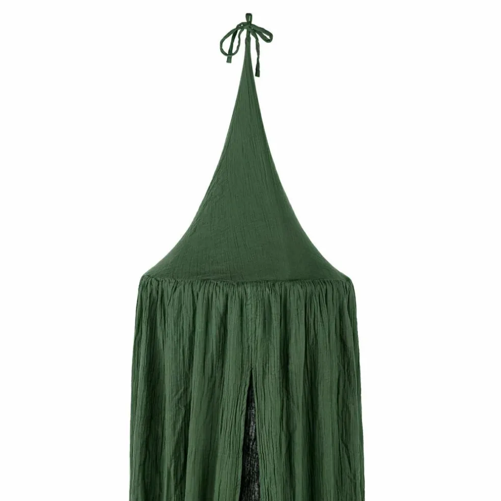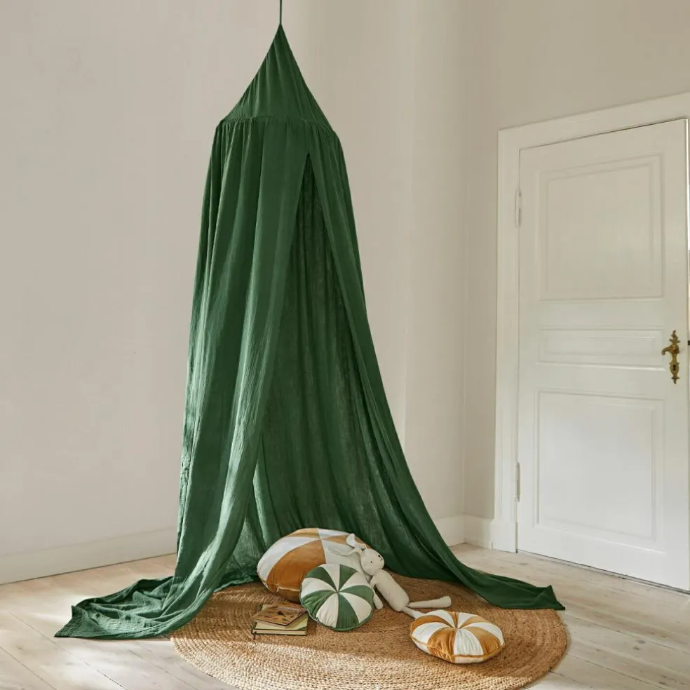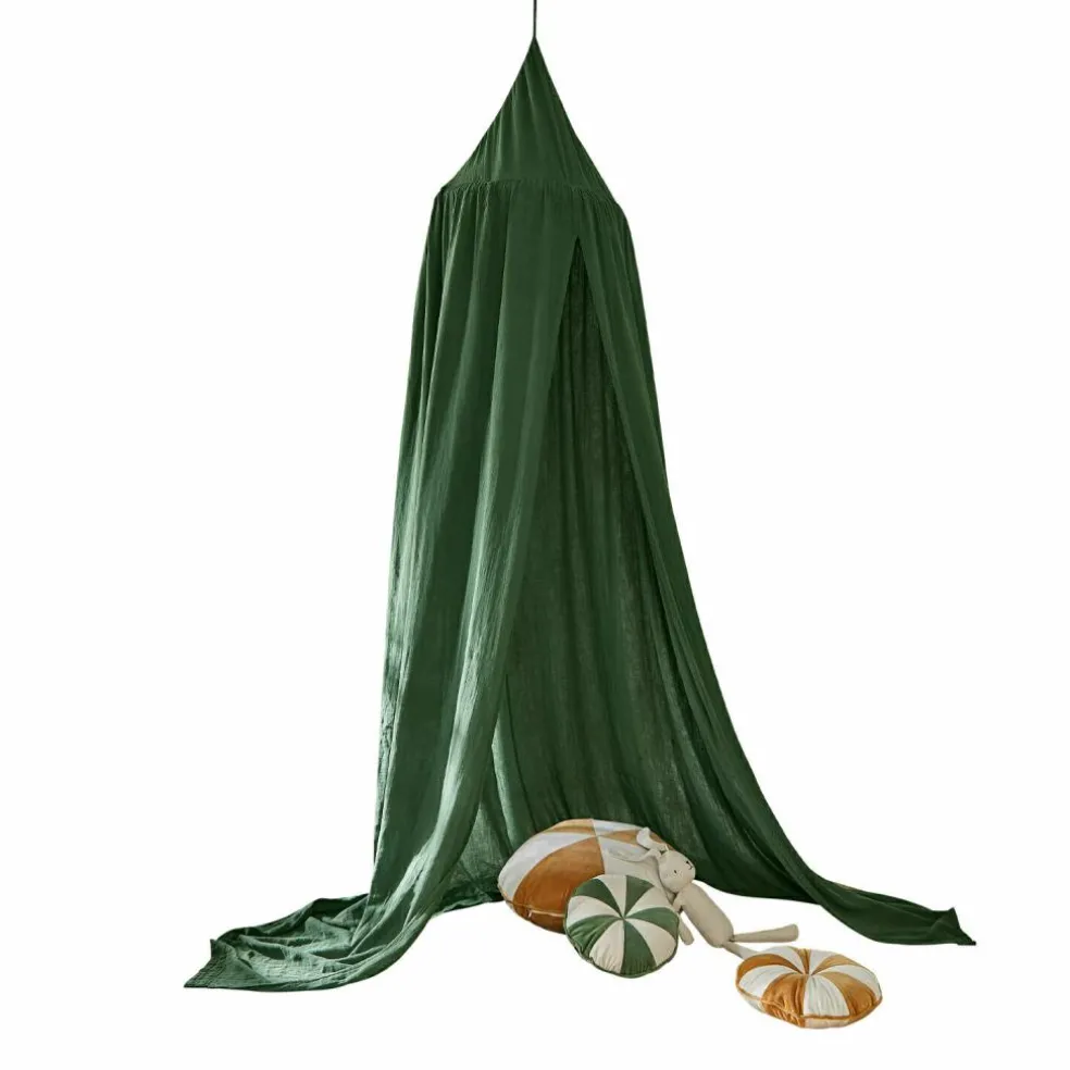 Verwandeln Sie das Kinderzimmer in ein Märchenreich mit diesem eleganten Betthimmel aus hochwertigem Musselin-Stoff. Die sanfte, tiefgrüne Farbe und die luftige Textur sorgen für eine gemütliche und beruhigende Atmosphäre, die zum Träumen einlädt. Der Betthimmel ist nicht nur ein dekoratives Highlight, sondern bietet auch praktische Funktionen: Mit einem stabilen Bambusring und Bindebändern lässt er sich leicht aufhängen und verschließen, sodass Ihr Kind sich sicher und geborgen fühlt. Dieser Betthimmel schafft einen zauberhaften Rückzugsort, der zum Spielen und Entspannen einlädt.