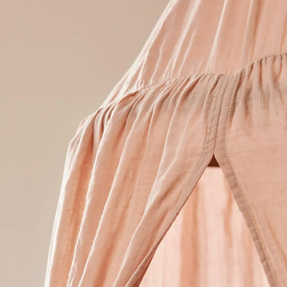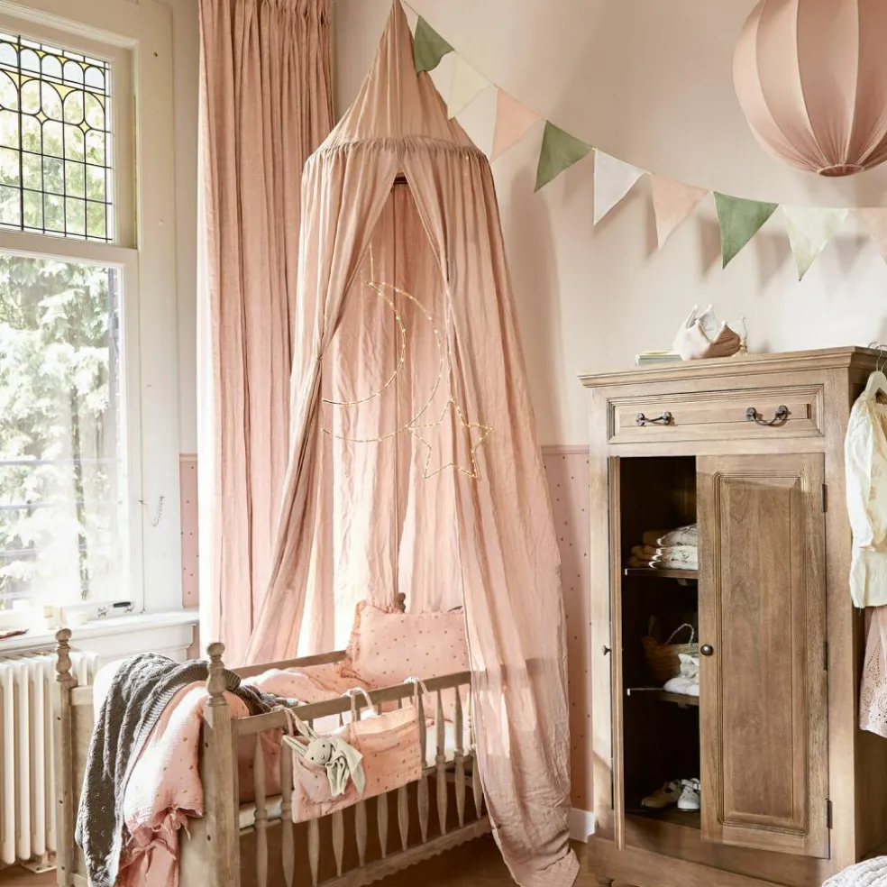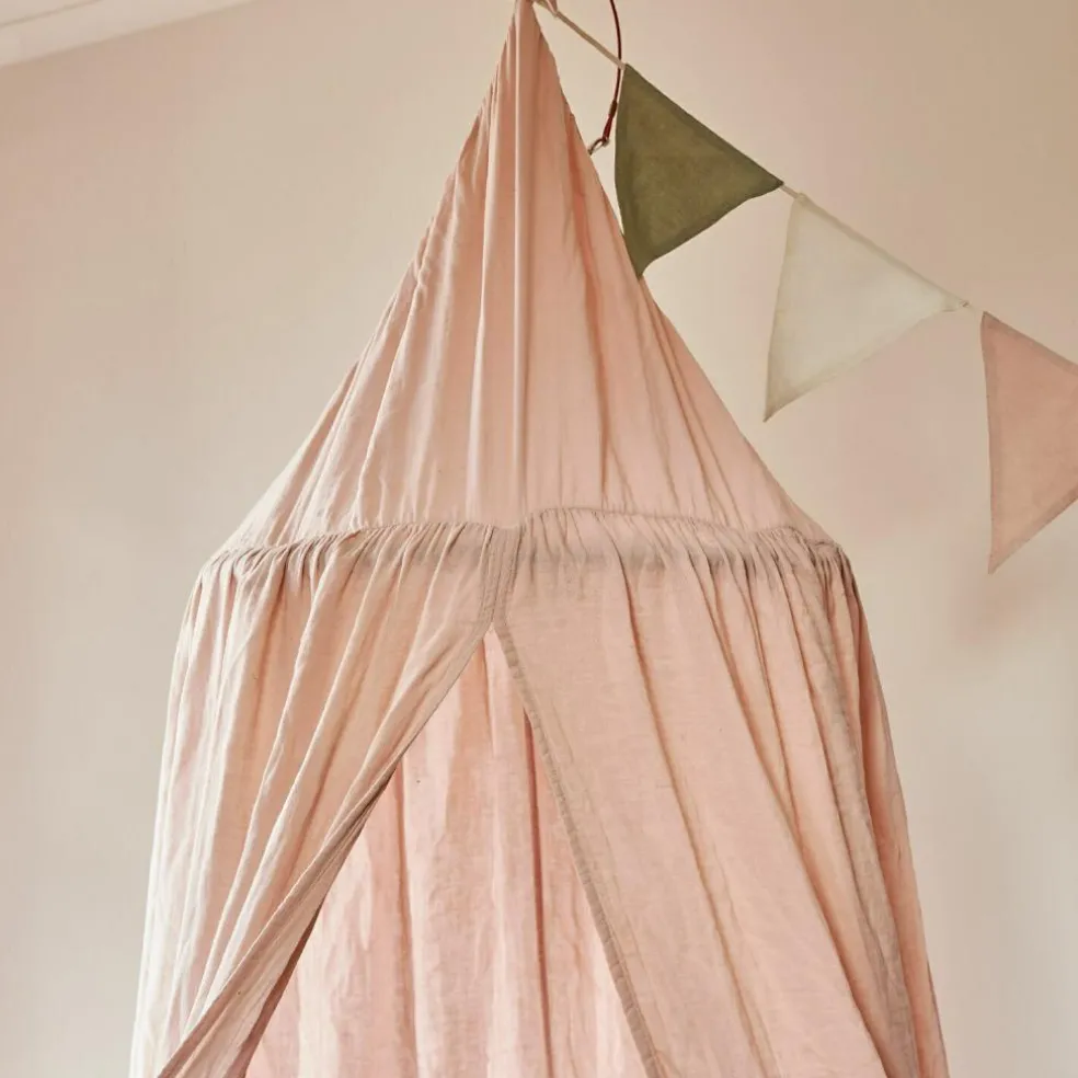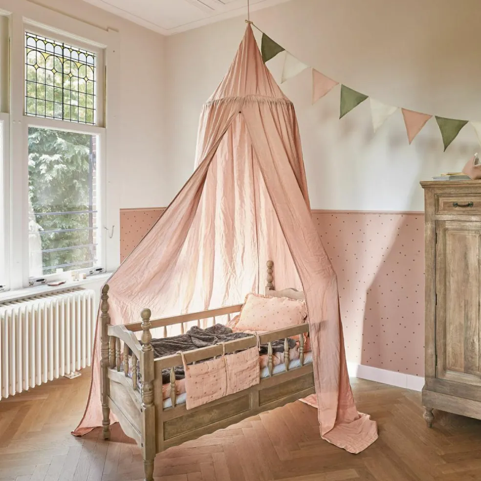 Dieser wunderschöne Betthimmel in sanftem Rosa verleiht dem Kinderzimmer eine märchenhafte Note. Gefertigt aus weichem Musselin aus reiner Baumwolle, bietet er eine behagliche Umgebung für jedes Kind. Der Betthimmel erhält seine elegante Form durch einen Bambusring, an dem der Stoff mit feinen Bindebändern befestigt wird. Perfekt geeignet als gemütlicher Rückzugsort zum Spielen oder Ausruhen, lässt er sich einfach an der Decke befestigen und sorgt für einen Hauch von Magie im Raum.