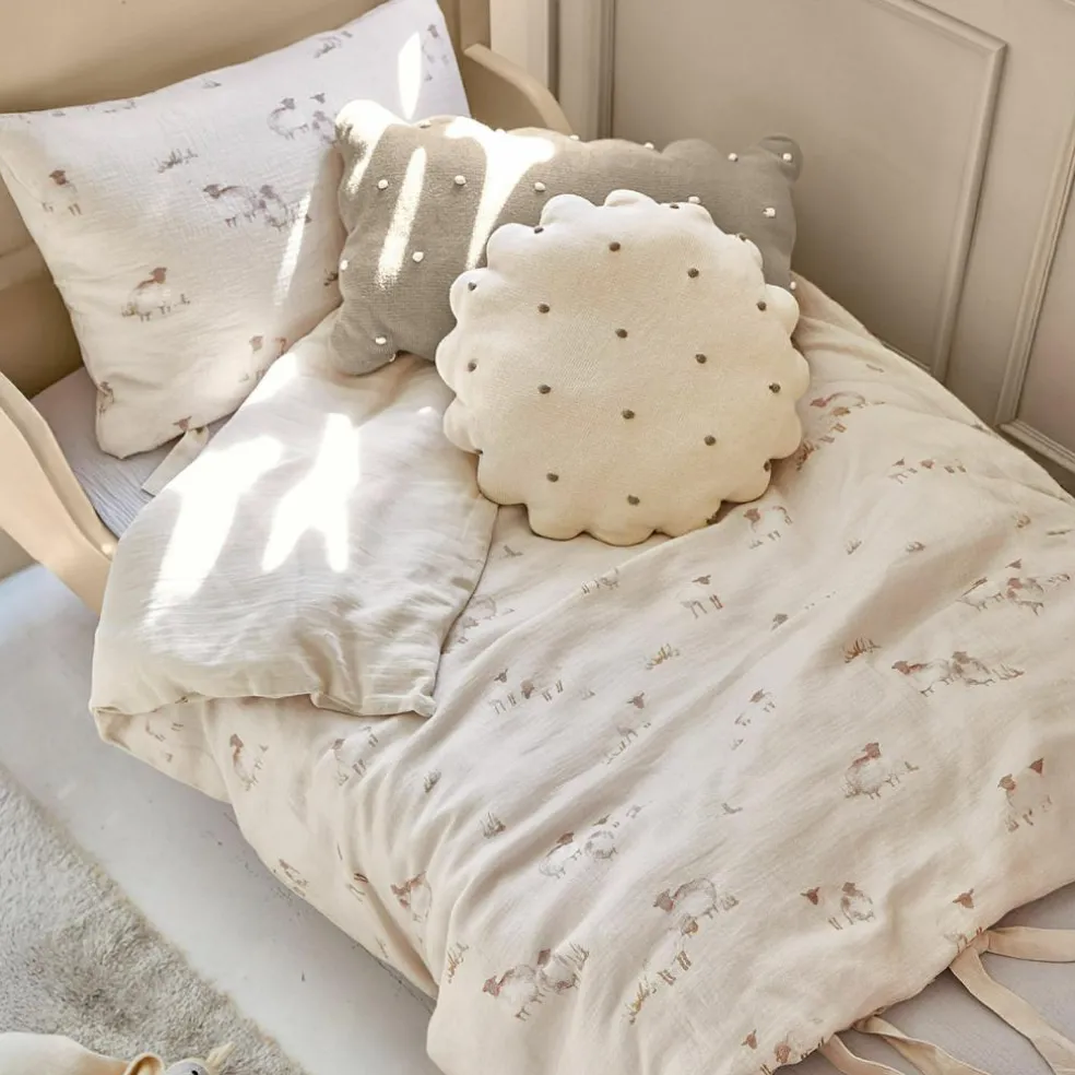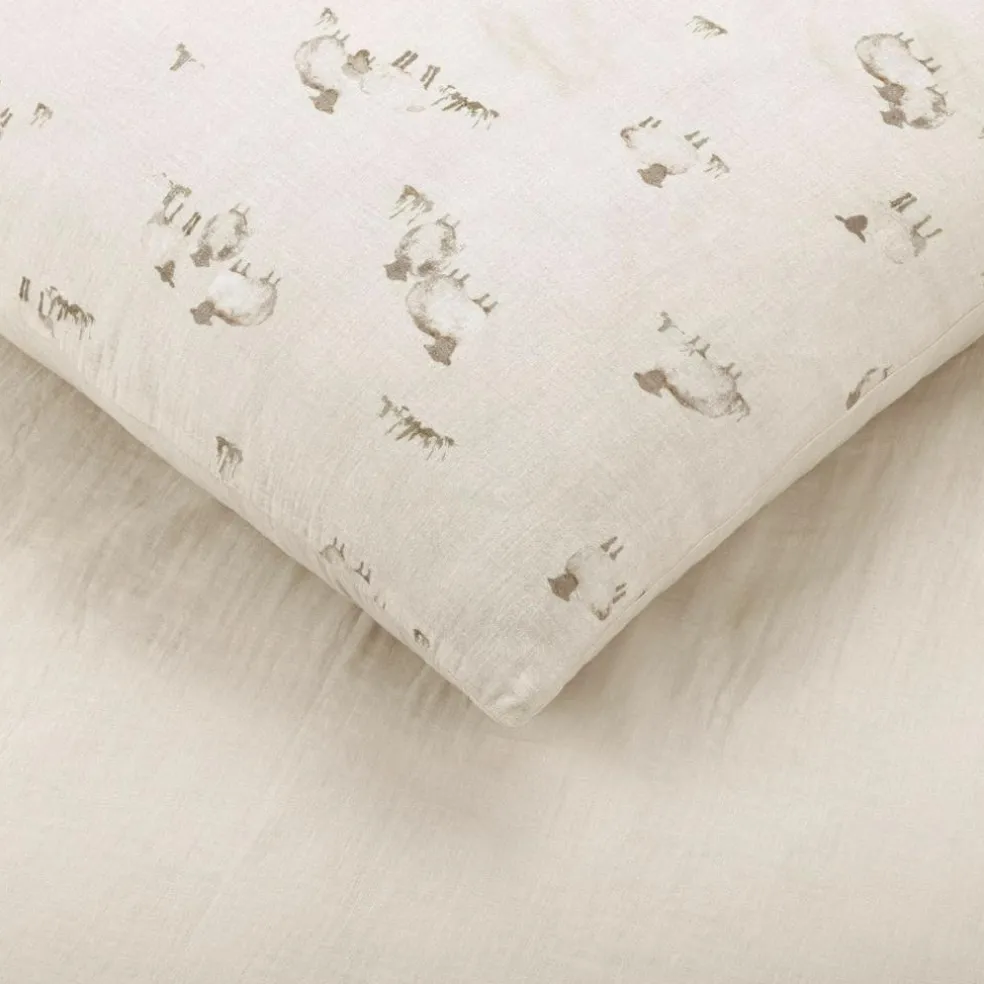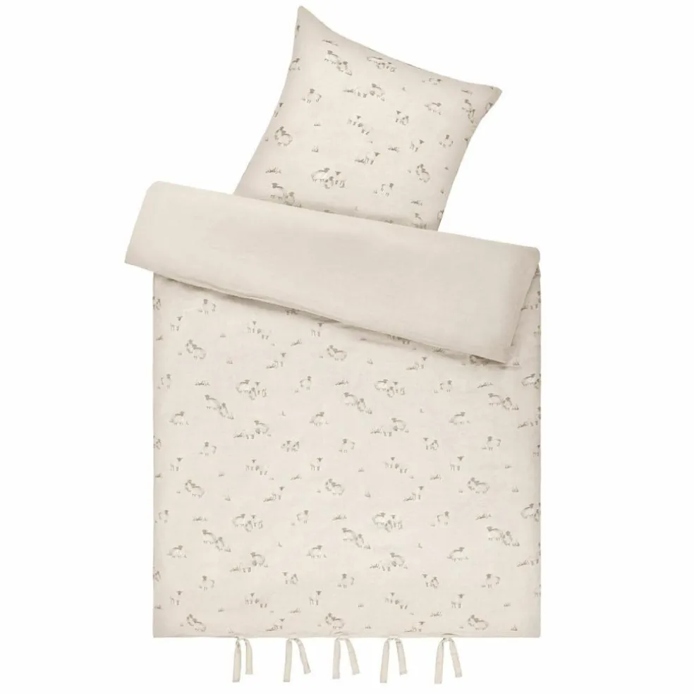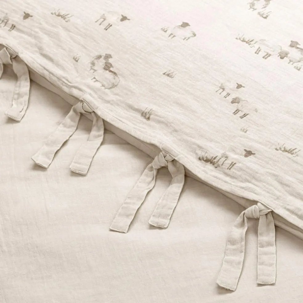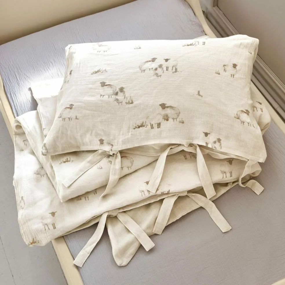 Einfach zum Verlieben: Diese Kinderbettwäsche erzählt mit jedem Blick kleine Geschichten vom Leben auf der Wiese. Die zarten Schaf-Motive wirken wie mit Aquarell gemalt und schaffen eine behagliche Atmosphäre, in der sich Kinder geborgen fühlen. Die Vorderseite aus reinem Baumwoll-Musselin lädt mit ihrer weichen, luftig gewebten Struktur zum Einkuscheln ein – perfekt für ruhige Nächte und süße Träume. Und weil auch Praktisches schön sein darf, sorgen Bindebänder nicht nur für sicheren Halt, sondern setzen auch verspielte Akzente am unteren Rand.