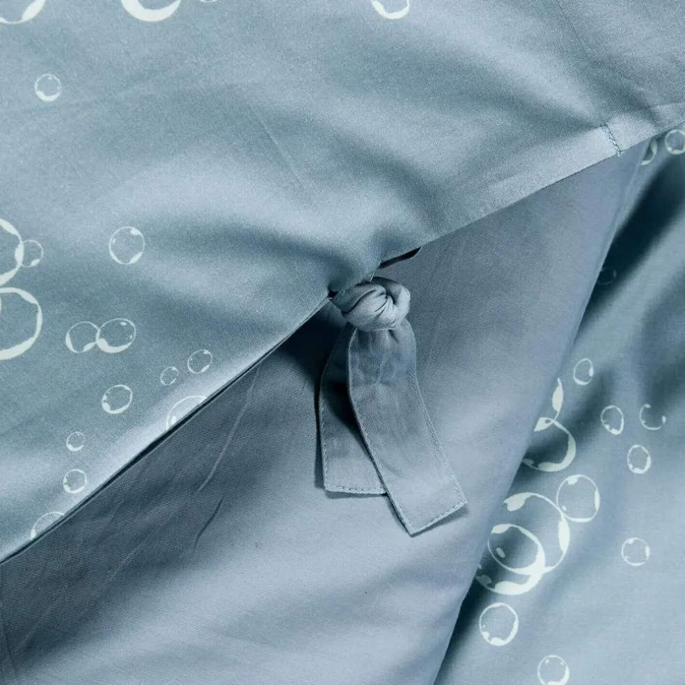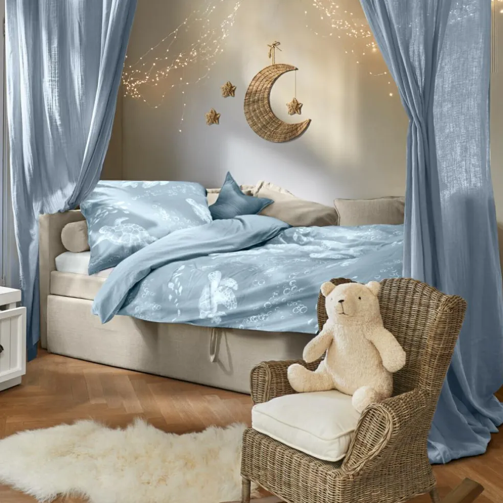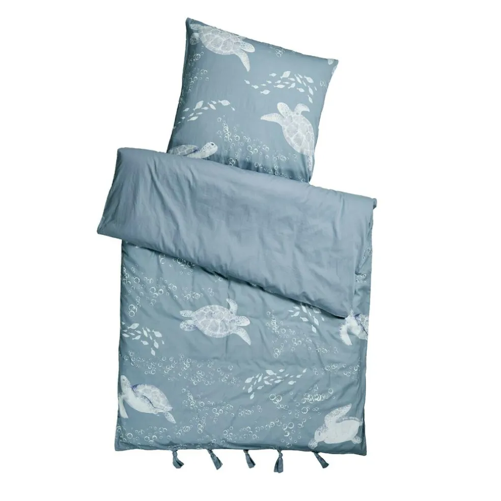 Wie ein sanftes Meeresrauschen wirkt diese Bettwäsche mit ihren träumerischen Schildkrötenmotiven. Die Unterwasserbewohner gleiten in zarten Weiß- und Grautönen über einen ruhigen, blauen Grund, begleitet von kleinen Blasen und Fischschwärmen – ein liebevoll gestalteter Print, der die Fantasie anregt und kleine Meerfreunde sanft in den Schlaf begleitet. Die reine Baumwolle fühlt sich angenehm glatt an und sorgt für ein ausgeglichenes Schlafklima. Dank der praktischen Bänder am unteren Ende lässt sich die Decke sicher fixieren – eine charmante Kombination aus Funktion und Design, die sowohl Kinder als auch Eltern begeistert.