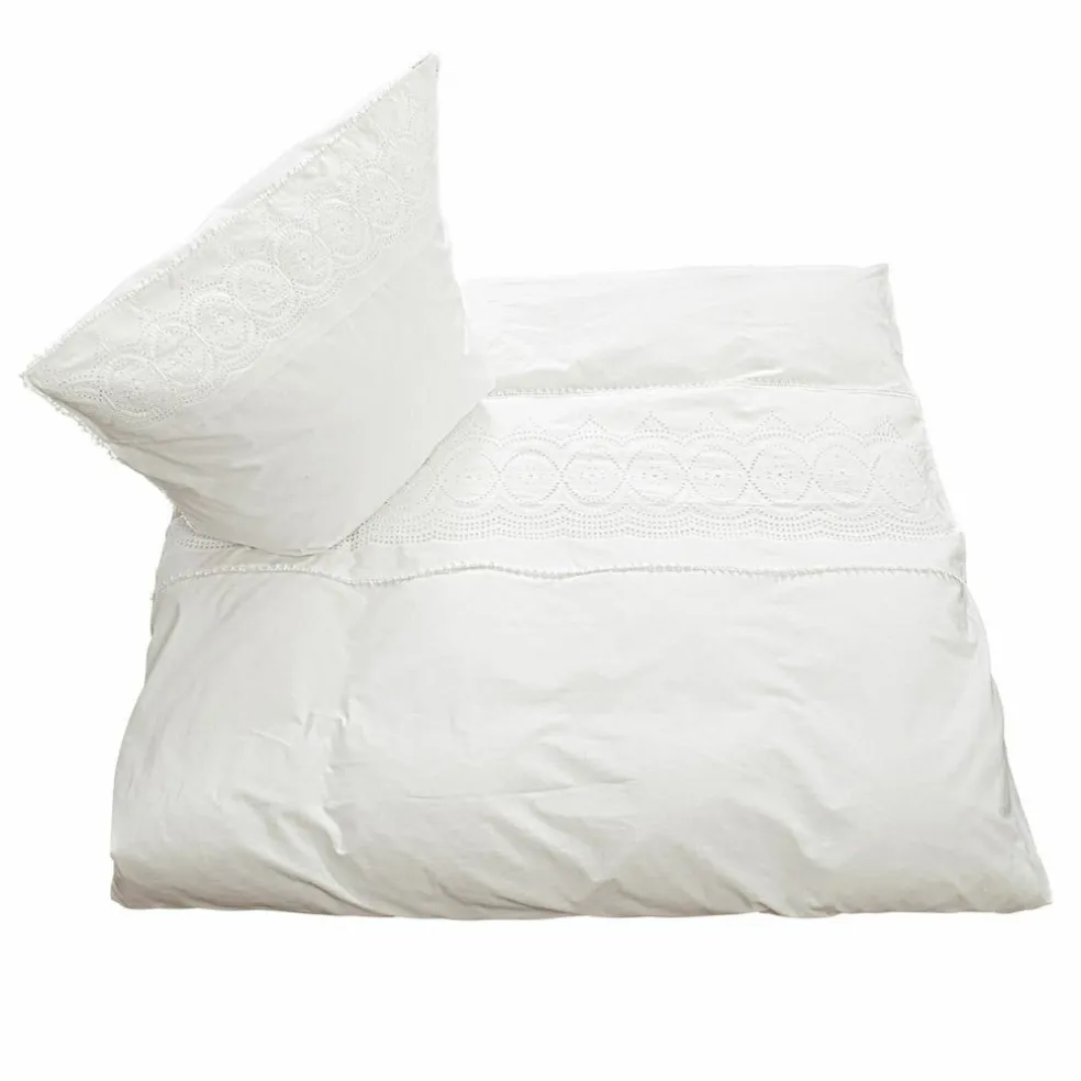 Ein romantischer Traum in Weiß! Mit ihrer üppigen Lochstickerei-Bordüre und dem reizvollen Spitzenabschluss erinnert die Bettwäsche an vergangene Zeiten, als man in den Schlafräumen nobler Landhäuser ganz selbstverständlich in edler, blütenweißer Wäsche ruhte. Was damals Tradition war, wird uns heute von Farbpsychologen bestätigt: Weiß im Schlafraum wirkt entspannend und erleichtert das mühelose Hinübergleiten in die Traumwelt. Und wenn vor dem Einschlafen Ihre Augen auf der nostalgischen Stickerei geruht haben, wird Ihnen vielleicht manche Nacht mit romantischen Träumen versüßt. Wie damals die Bettwäsche stets sorgfältig aus hochwertigen Materialien gearbeitet war, so ist das auch bei dieser Bettwäsche der Fall. Die weiche, atmungsaktive Baumwolle schmeichelt der Haut beim Hineinkuscheln, sorgt für ein angenehmes Klima und einen erholsamen Schlaf – im Sommer wie im Winter. Kopfkissen und Bettbezug werden stilecht mit nostalgischen Bindebändern geschlossen.
