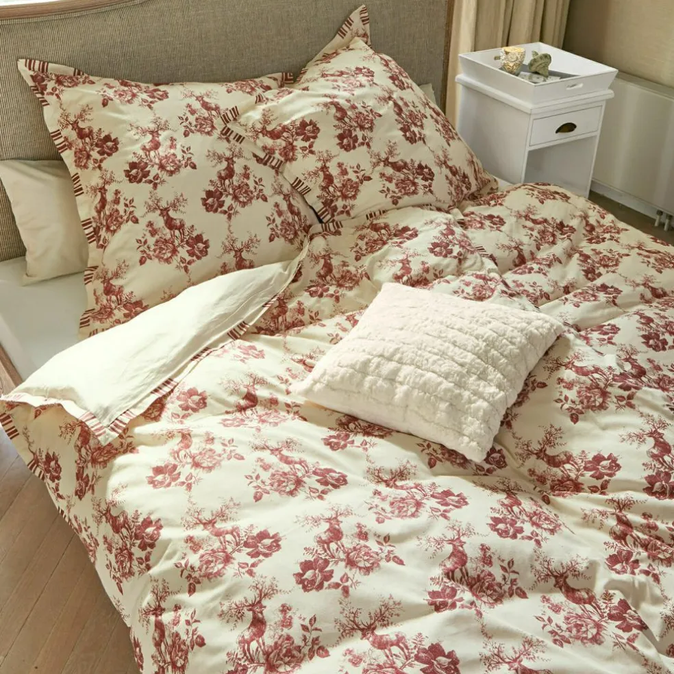 Verleihen Sie Ihrem Schlafzimmer eine charmante Note mit dieser atemberaubenden Bettwäsche im Leinen-Baumwolle-Mix. Die zarten roten Blumenmotive auf cremeweißem Hintergrund im Toile-de-Jouy-Stil sorgen für eine gemütliche Atmosphäre, während die umlaufende Bordüre und die praktischen Bindebänder das Gesamtbild harmonisch abrunden. Genießen Sie den Komfort und die Weichheit dieser hochwertigen Bettwäsche, die Ihr Bett in eine Wohlfühloase verwandelt.