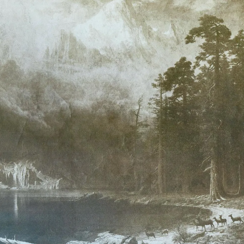 Dieses Wandbild ist mehr als Dekoration – es ist ein stiller Erzähler. Die Szene zeigt eine wilde, unberührte Berglandschaft: sanfte Hänge, hoch aufragende Gipfel und eine Gruppe Hirsche, die sich durch das flache Ufer bewegt – eingefangen in feinen Abstufungen von Braun und Ocker. Die Optik erinnert an alte Lithografien oder verblasste Drucke aus längst vergangenen Tagen. Der Druck auf wiederaufbereitetem Papier verstärkt diesen Eindruck – man meint fast, das Rascheln vergilbter Seiten zu hören. Gerahmt wird das Motiv von zwei schlichten Holzelementen aus wiederverwendetem Kiefernholz, deren weiß gekalkte Oberfläche wie verwittert wirkt – als hätte man das Bild so in einer Jagdhütte in den Alpen gefunden. Ein stilles Kunstwerk mit Seele, das sowohl Nachhaltigkeit als auch Erzählkraft an die Wand bringt.