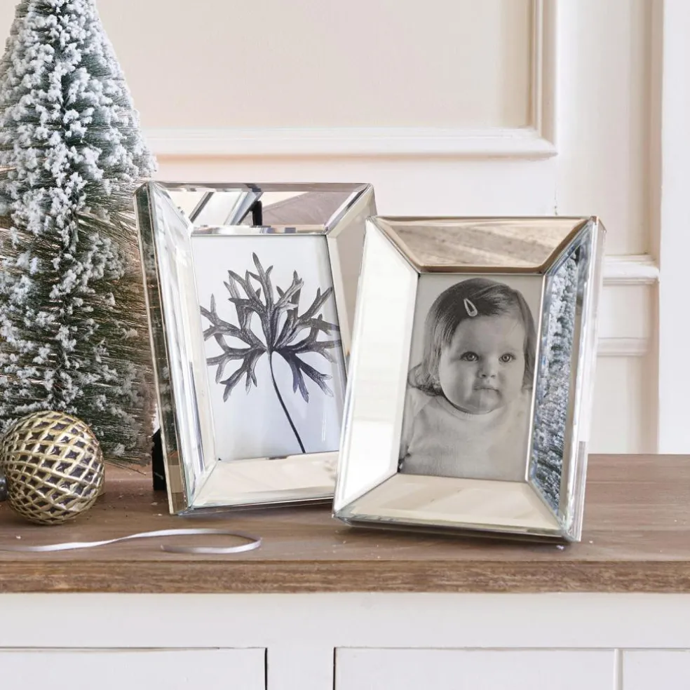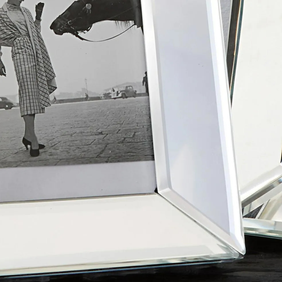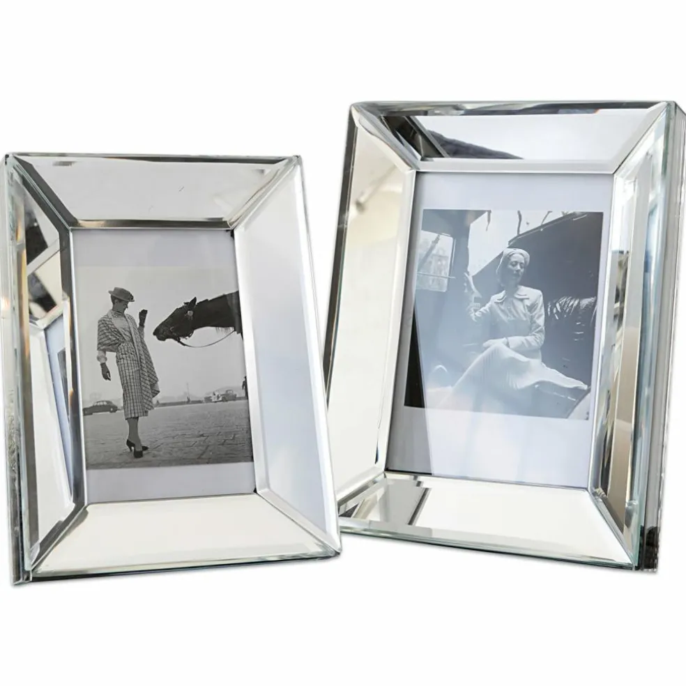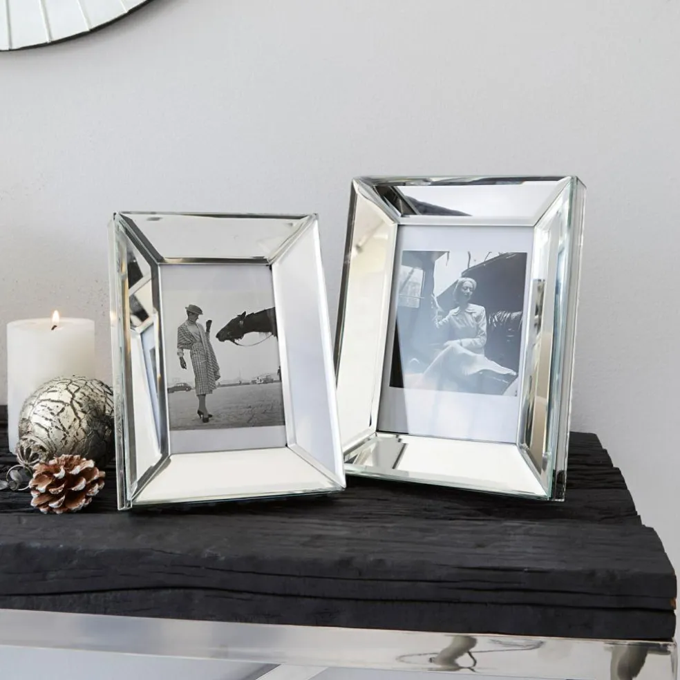 Zeitlose Eleganz, die Ihren liebsten Bildern den perfekten Rahmen verleiht. Die beiden edlen Bilderrahmen in zwei Größen fangen mit ihren schicken verspiegelten Rahmen aus Glas den Blick ein. Sie eignen sich zum Aufstellen, sowohl hochkant als auch im Querformat. Ihre Rückseite ist mit weichem, dunklem Filz bezogen. Das Set in zwei Größen wirkt reizvoll als Duo, aber auch einzeln versprüht jedes Modell seinen Charme. Ob Fotos vom Familienurlaub, Hochzeitsbilder, kleine Kunstwerke der Kinder, schöne Drucke oder Collagen, hiermit zieht künstlerisches Flair in Ihr Zuhause ein. Ein geschmackvolles Duo, das und jeden Raum ziert.
