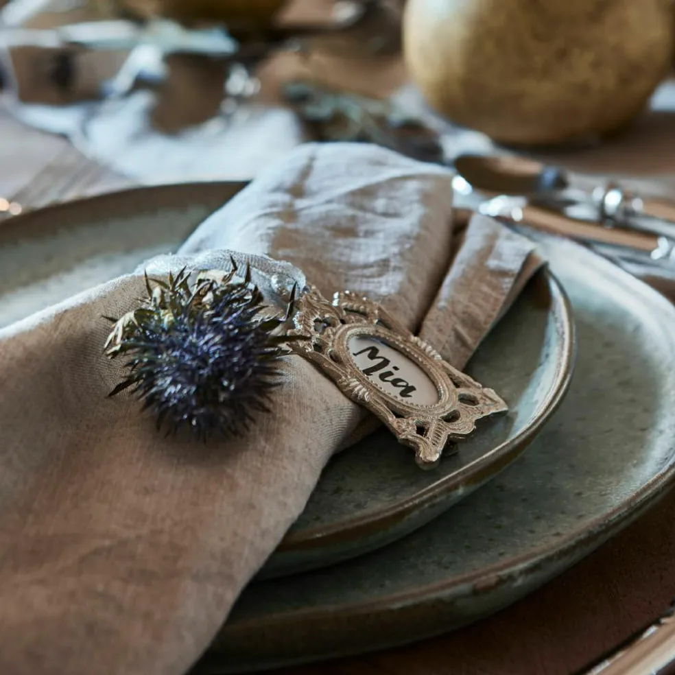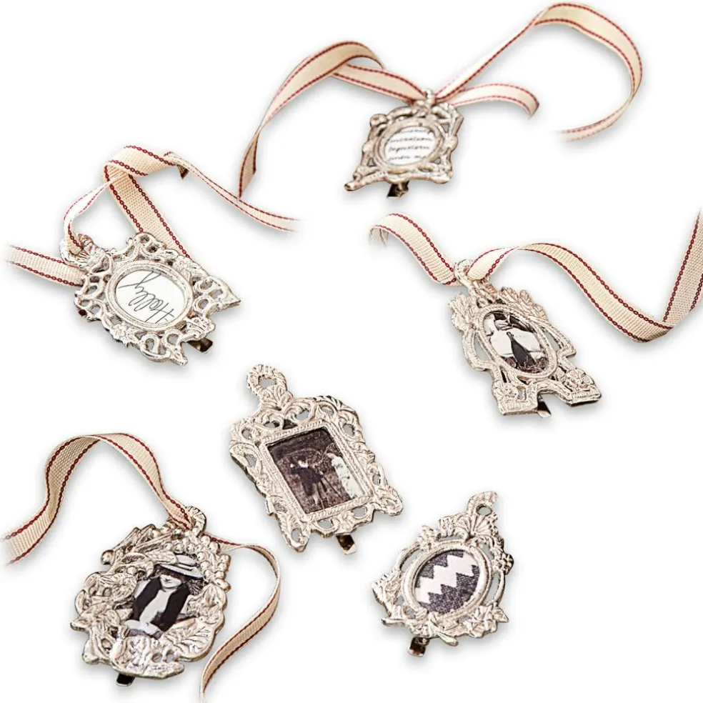 Die Miniatur-Bilderrahmen aus Messing wurden handbearbeitet und mit einem Finish in Antiksilber versehen. Die Bilder lassen sich im Handumdrehen auswechseln – eine eingearbeitete Öse dient zum Auffädeln auf ein Band oder eine Schnur. So werden die sechs Bilderrahmen zu einer mehr als originellen Alternative zum klassischen Serviettenring, zu einem besonders edlen Geschenkanhänger oder zum Baumschmuck mit Hingucker-Garantie. Einfach ein Foto, ein Namenskärtchen oder ein hübsches Initial hinein – fertig! In sechs unterschiedlichen Designs.