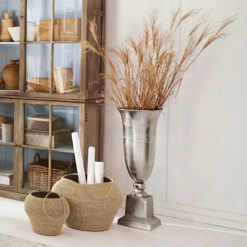 Die imposante Bodenvase in klassischer Pokalform wurde in Handarbeit mit einem Finish in Antiksilber versehen und matt gebürstet. So ist das außergewöhnliche Objekt nicht nur besonders unempfindlich in der Handhabung und Pflege, sondern auch ein ganz besonders schöner Anblick. Ob ganz pur oder gefüllt mit blühenden Ästen oder langstieligen Lilien – diese Bodenvase verleiht jedem Raum im Handumdrehen das gewisse Etwas. Unser Tipp: Großzügige Wohnräume oder auch der Eingangsbereich werden von dieser Vase – besonders auch im Doppelpack – absolut stilvoll dekoriert und geradezu geadelt.