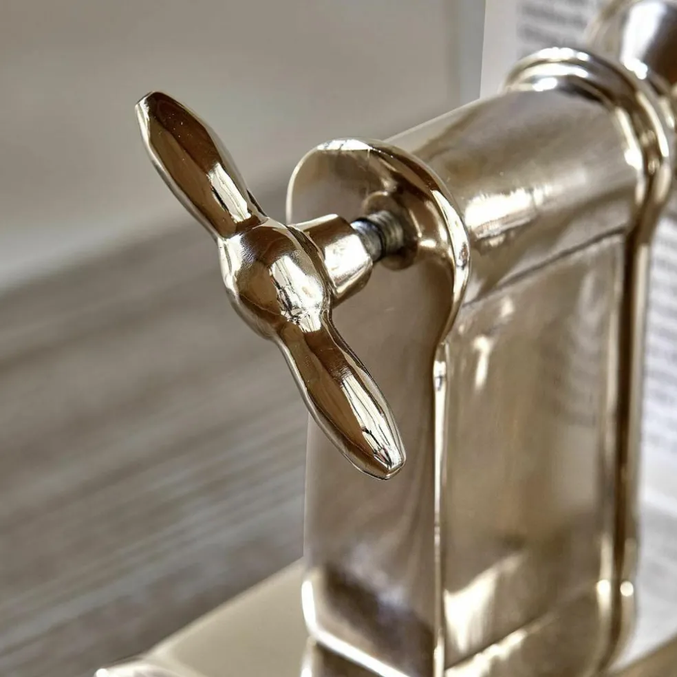 Diese Buchstützen sind mehr als nur stilvolle Helfer – sie überraschen mit cleverem Design und einem kleinen Funktions-Extra. Inspiriert von alten Kurbelpressen, ziehen sie mit ihrer nostalgischen Form sofort alle Blicke auf sich. Die Oberfläche glänzt in poliertem Metall und verleiht dem Ganzen eine moderne Note. Und das Beste: Die Schrauben sind nicht nur Zierde, sondern tatsächlich beweglich – perfekt für alle, die das Spielerische lieben. In Regalen, auf Schreibtischen oder Kommoden bringen sie Ordnung und ein Augenzwinkern zugleich. Robuste Verarbeitung trifft auf durchdachte Details – ein echtes Statement für Individualisten.