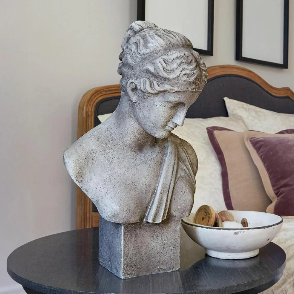 Wie eine Entdeckung in einem alten Garten oder auf einem verwunschenen Landsitz wirkt diese Büste – voller Poesie und Geschichte. Die grazile Form, die dezent geschwungene Schulterpartie und der leicht geneigte Kopf erzählen von Anmut und Innerlichkeit. Ihre steinähnliche Oberfläche zeigt feine Unebenheiten, die ihr Charakter verleihen und den Eindruck echter Patina erzeugen. Das Material aus Polyresin macht sie dabei zugleich standfest und angenehm leicht. Auf einer Konsole, einem Regal oder im Eingangsbereich wird sie zum Blickfang, der das Auge fesselt und die Fantasie anregt.