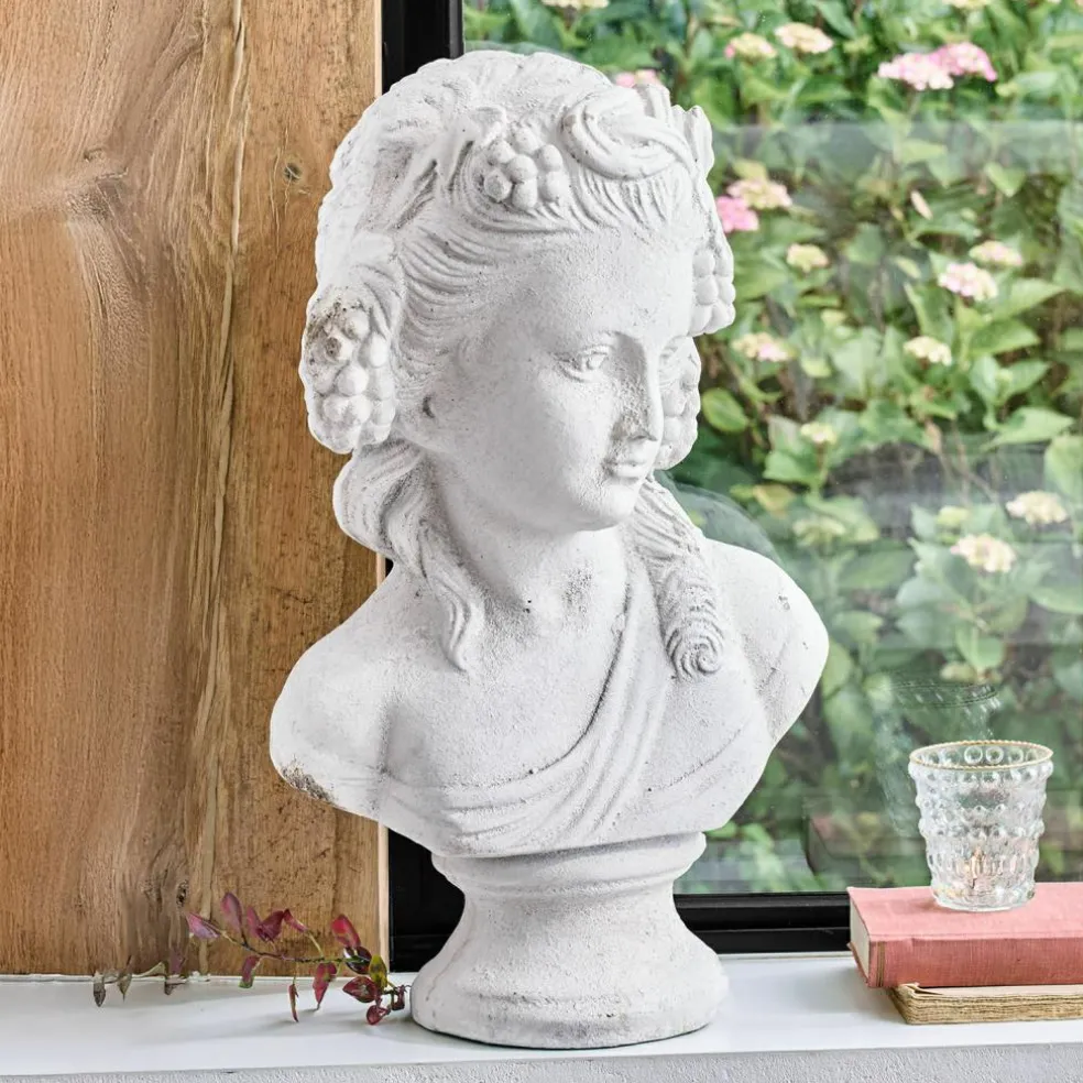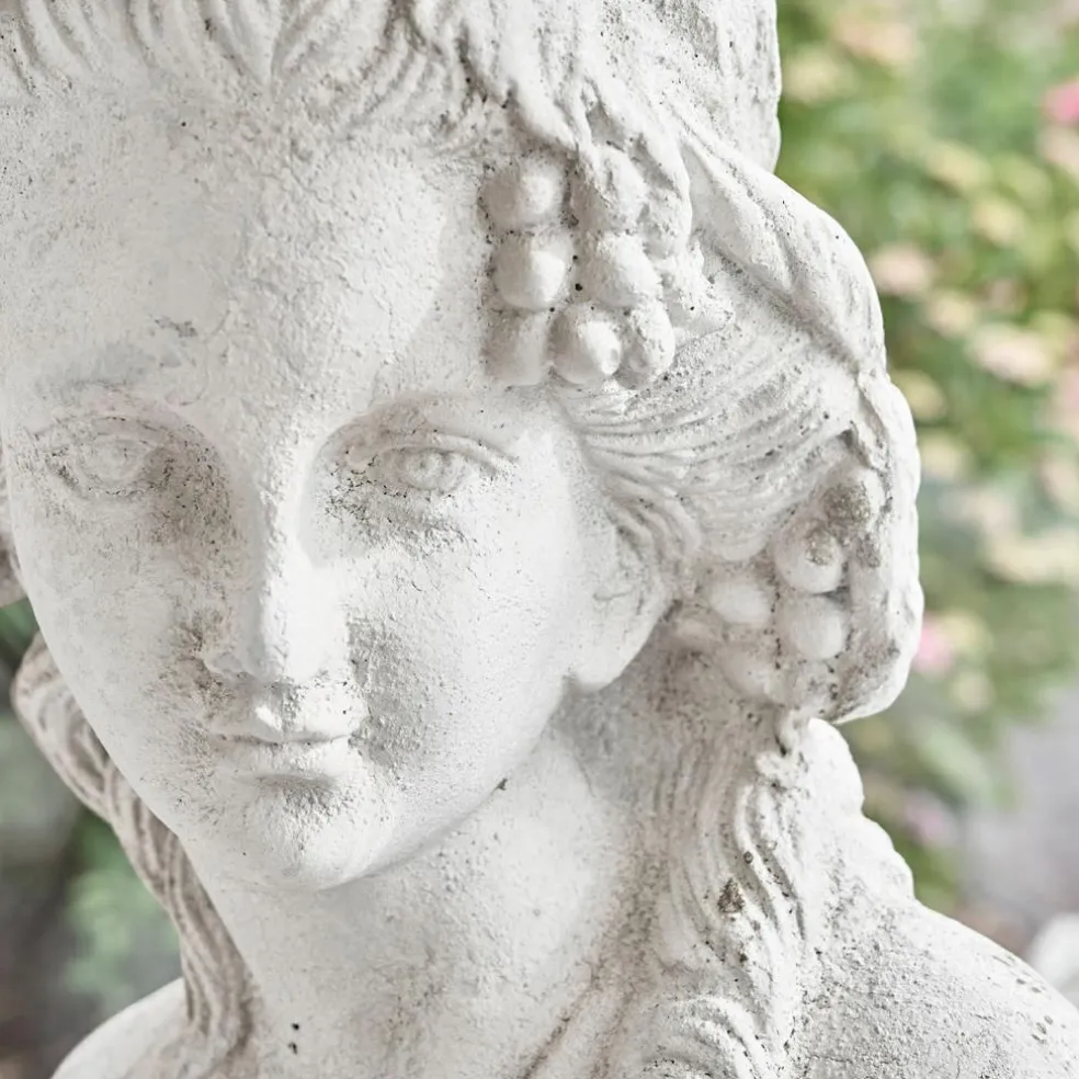 Wie aus einem verträumten Gartensalon der Belle Époque entstiegen, verleiht diese Büste jedem Raum eine ruhige, beinahe poetische Atmosphäre. Die fein gearbeiteten Gesichtszüge und das ornamental gewundene Haar erzählen von klassischer Handwerkskunst, während das matte, elfenbeinfarbene Finish mit gewollten Alterungsspuren ihr die Aura eines lang gehüteten Erbstücks verleiht. Hergestellt aus wetterresistentem Kunststein, lässt sie sich sowohl im Innenbereich auf Konsolen oder Kaminsimsen inszenieren als auch auf der Terrasse oder zwischen blühenden Beeten als Blickfang platzieren. Eine Hommage an die zeitlose Schönheit der Antike – mit einem charmanten Hauch Romantik.