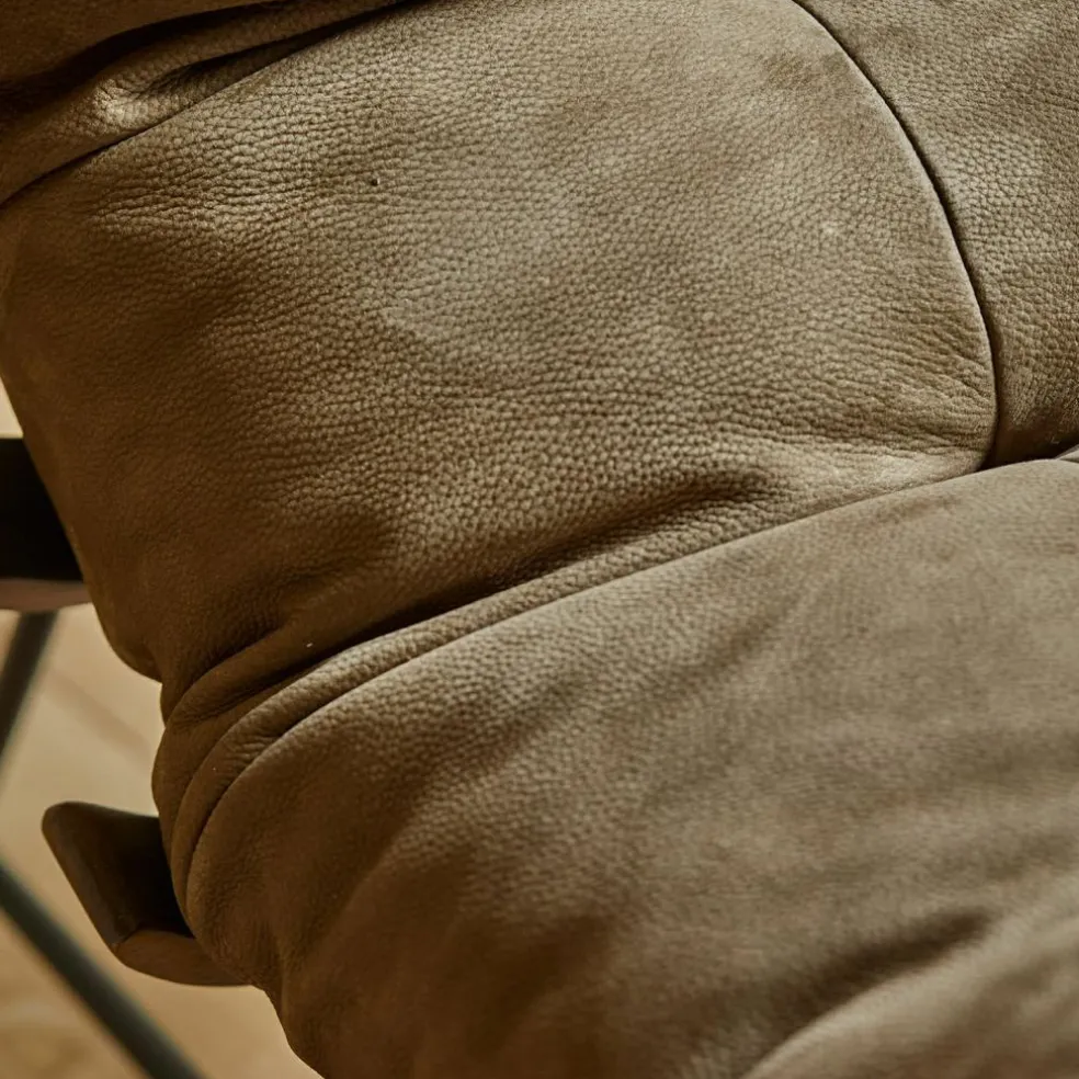Diese Chaiselongue ist mehr als nur ein Sitzmöbel – sie ist ein persönliches Ruheversprechen. Der Bezug aus echtem Nubukleder besticht durch seine samtige Haptik, die sich mit jedem Griff vertrauter anfühlt – ein Leder mit Charakter und Tiefe. Großzügige Steppungen betonen die voluminöse Polsterung und laden zum Einsinken und Verweilen ein. Das solide Gestell aus Eisen trägt die weich gepolsterte Fläche mit Leichtigkeit, während geschwungene Latten aus warmem Holz dem Design handwerkliche Raffinesse verleihen. Lederbänder verbinden Sitzfläche und Unterbau auf charmante Weise – ein liebevolles Detail, das den Manufaktur-Charakter unterstreicht. Als Ergänzung zum Sessel „Horraine“ (23770) entsteht ein Ensemble aus Komfort, Stil und Substanz – für entspannte Stunden mit Anspruch.