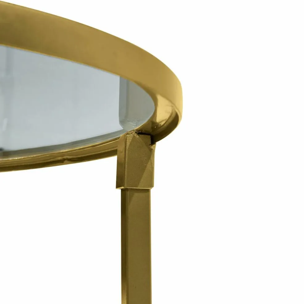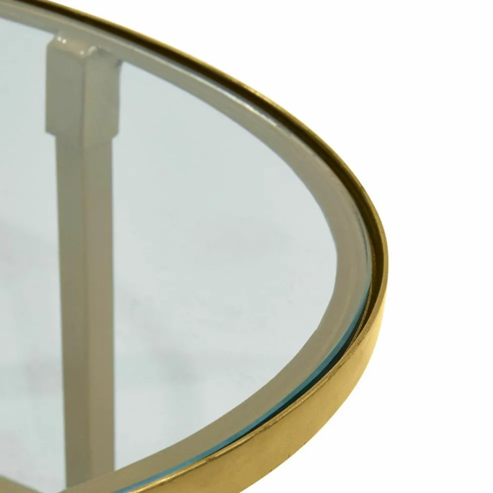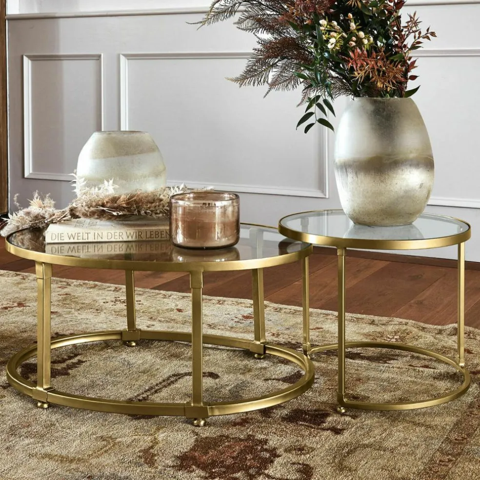 Elegante Eyecatcher ziehen ein in Ihr Ambiente. Mit einer gelungenen Mischung aus Nostalgie und Zeitlosigkeit besticht dieses exquisite Tisch-Set, das in Form und Größe perfekt aufeinander abgestimmt ist. Der größere Tisch in ovaler Gestalt, der kleinere in runder Formgebung. Das Design lässt den glamourösen Art Déco-Stil der vergangenen 20er Jahre wieder aufleben. Schon damals spielten die Gestalter gerne mit hochwertigen Materialien, leicht und klarlinig sollte es dennoch sein. Ganz so wie bei diesen Schmuckstücken: Das Gestell ist aus massivem Eisen mit messingfarbenen Antik-Finish gestaltet und wird abgerundet durch eine klare Glasplatte, die sich als Ablage für schöne Dekoakzente und Sonstiges anbietet. Eigentlich ist jeder Tisch sich selbst genug. Doch zusammen verschmelzen sie wie ein stilvolles Kunstobjekt zu einem vollendeten Gesamtbild. Aufgrund ihres zurückhaltenden Charakters lassen sich die Tische mit nahezu allen Stilrichtungen und Farbtönen kombinieren – perfekt zu klassischem Mobiliar, reizvoll als Kontrast zu modernem Design. Ihre Couch ergänzen sie eindrucksvoll und geben ihr trotzdem Raum zur Entfaltung, mal als Duo, mal in Einzelstellung. Auch im Schlafraum als Nachttisch geben sie eine gute Figur ab.