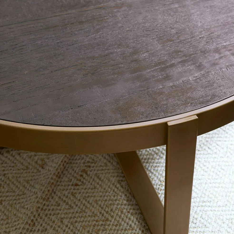 Mit diesem Couchtisch zieht ein besonderes Stück Wohnkultur ein: Die runde Tischplatte aus wiederaufbereitetem Eichenholz offenbart eine lebendige Maserung, in der sich Vergangenheit und Charakter vereinen. Leichte Unregelmäßigkeiten, charmante Farbverläufe und das matte Finish verleihen der Oberfläche eine authentische Ausstrahlung. Das goldfarbene Eisengestell bildet dazu den perfekten Rahmen – geradlinig, stabil und mit einem dezenten Schimmer, der das Licht einfängt. Die weiche Rundung der Form macht den Tisch nicht nur ästhetisch ansprechend, sondern auch besonders einladend – ein echtes Herzstück für gemütliche Stunden im Wohnzimmer.