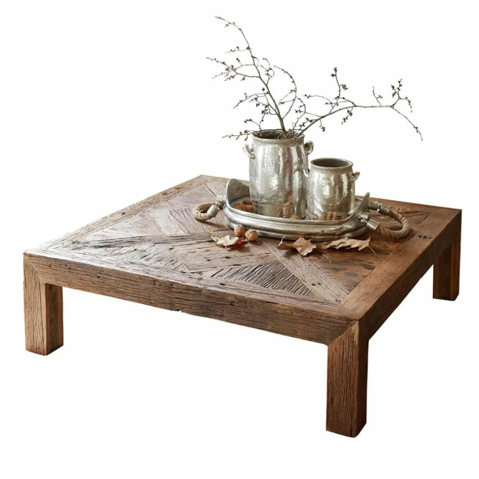 Wiederaufbereitetes Holz erobert seit einigen Jahren die Werkstätten ambitionierter Möbeldesigner, denn das charakterstarke Naturmaterial macht mit seinen Rissen und Unebenheiten sowie der markanten Maserung jedes Möbelstück zu einem faszinierenden Blickfang. Bei diesem Couchtisch darf das wiederaufbereitete Salbaumholz nicht nur die Geschichte seines ereignisreichen Lebens erzählen, der Designer hat es sich nicht nehmen lassen, die Tischplatte im Stil traditioneller Einlegetechnik mit einem Schachbrettmuster zu schmücken, das die markante Maserung und Textur des Holzes besonders reizvoll zur Wirkung bringt. Mit diesem rustikalen Flair und dem wohnlich-warmen Naturton ergänzt der Couchtisch besonders schön Sofas im Landhaus-Look, er kann sich mit seiner Persönlichkeit aber auch im modernen Loft-Ambiente behaupten. Gönnen Sie sich einen Couchtisch mit Unikat-Charakter, der zugleich nachhaltig ist!