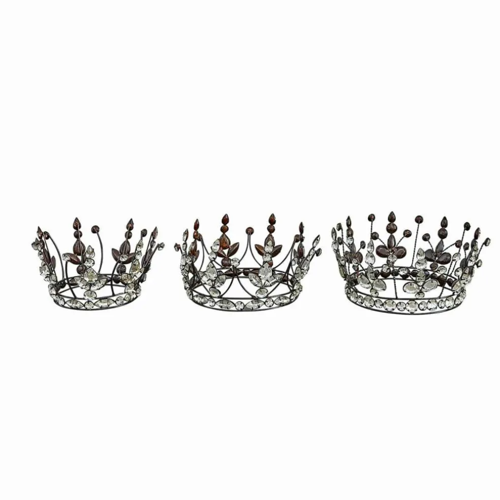 Mit diesem edlen Trio kommt wahrlich royales Flair auf. Die drei schönen Deko-Kronen mit aufwendiger Gestaltung bestehen aus Eisen, das filigran bearbeitet wurde. Besonders schön sieht man dies an einzelnen miteinander verdrehten Elementen. Alle Kronen sind zudem mit funkelnden Glassteinen besetzt, die dem royalen Charme noch mehr Glamour verleihen. Hiermit lassen sich sehr stimmungsvolle Akzente setzen, welche bestens zum Shabby-Chic passen. Das ganze Jahr hindurch können Sie sich mit diesen Schmuckstücken wie eine Königin fühlen und jedem Raum eine verspielte, feminine Note verleihen. Als Zierde im Regal, auf einer Anrichte oder als Tischschmuck lassen sich mit den edlen Kronen ganz leicht attraktive Deko-Arrangements zaubern.
