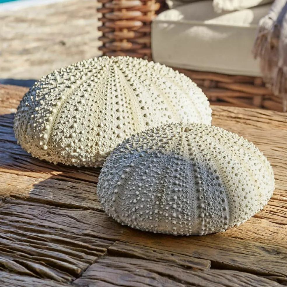 Lust auf ein bisschen Urlaubsfeeling auf der Terrasse? Dann buchen Sie nicht den nächsten Urlaub, sondern umgeben sich einfach mit ein paar Deko-Objekten, die maritimes Flair verbreiten – wie dieses hübsche Deko-Seeigel Pärchen. Wer schon einmal bei einem Tauchgang in einem der Weltmeere Seeigel live beobachten konnte, weiß zwar, dass es viele verschiedene Erscheinungsformen gibt, er wird aber auch bemerken, mit welcher Kunstfertigkeit und Sorgfalt der Künstler die Haupt-Charakteristika der Gehäuse dieser kleinen Stachelbälle nachgearbeitet hat. Als Material wählte er modernes Polyresin, einen relativ schweren Kunststein, der sehr robust und witterungsbeständig ist, sodass die beiden Deko-Seeigel unbesorgt den ganzen Sommer im Freien verbringen können und mit ihrem strahlend weißen Finish an entspannte Urlaubstage am Meer erinnern.