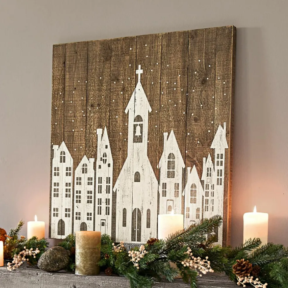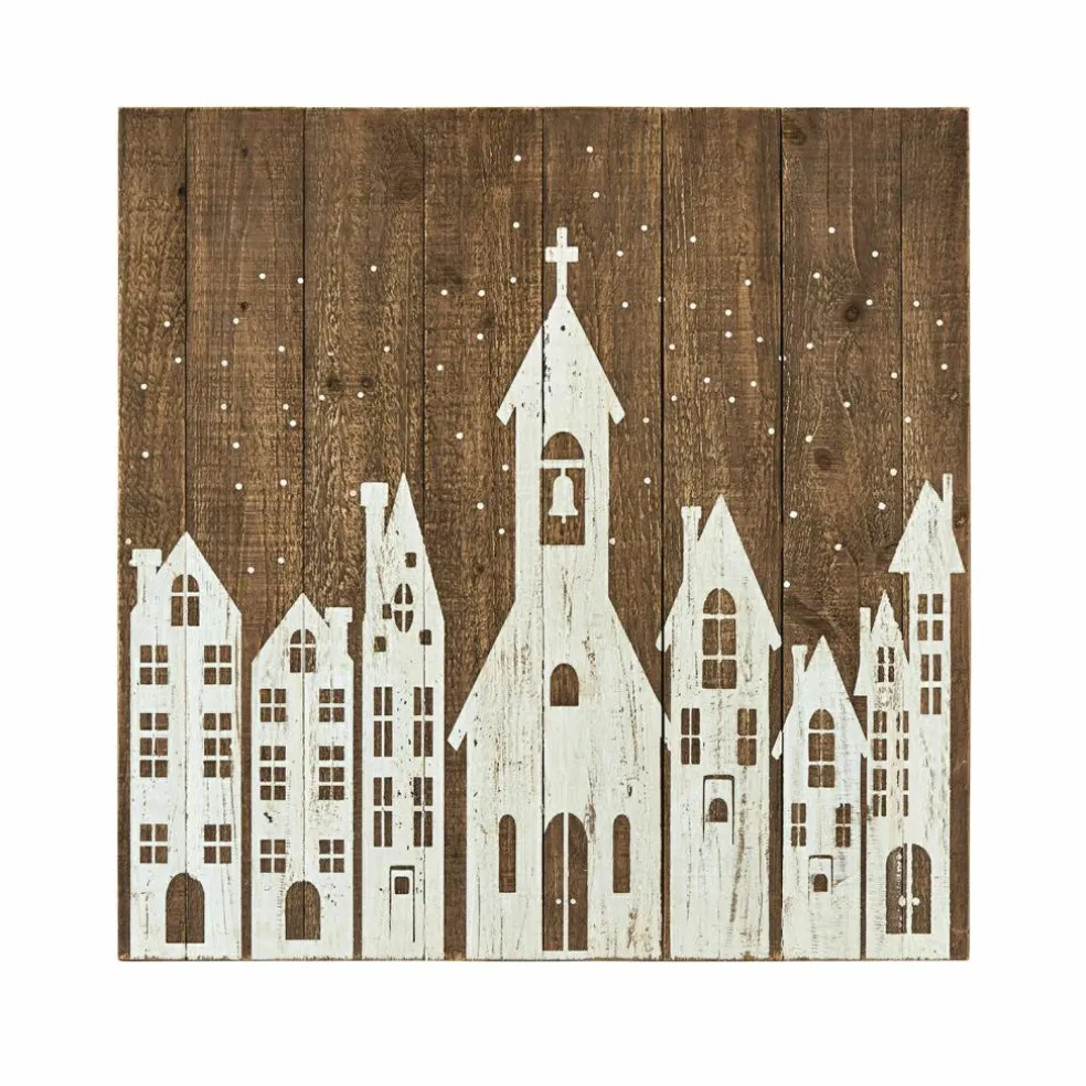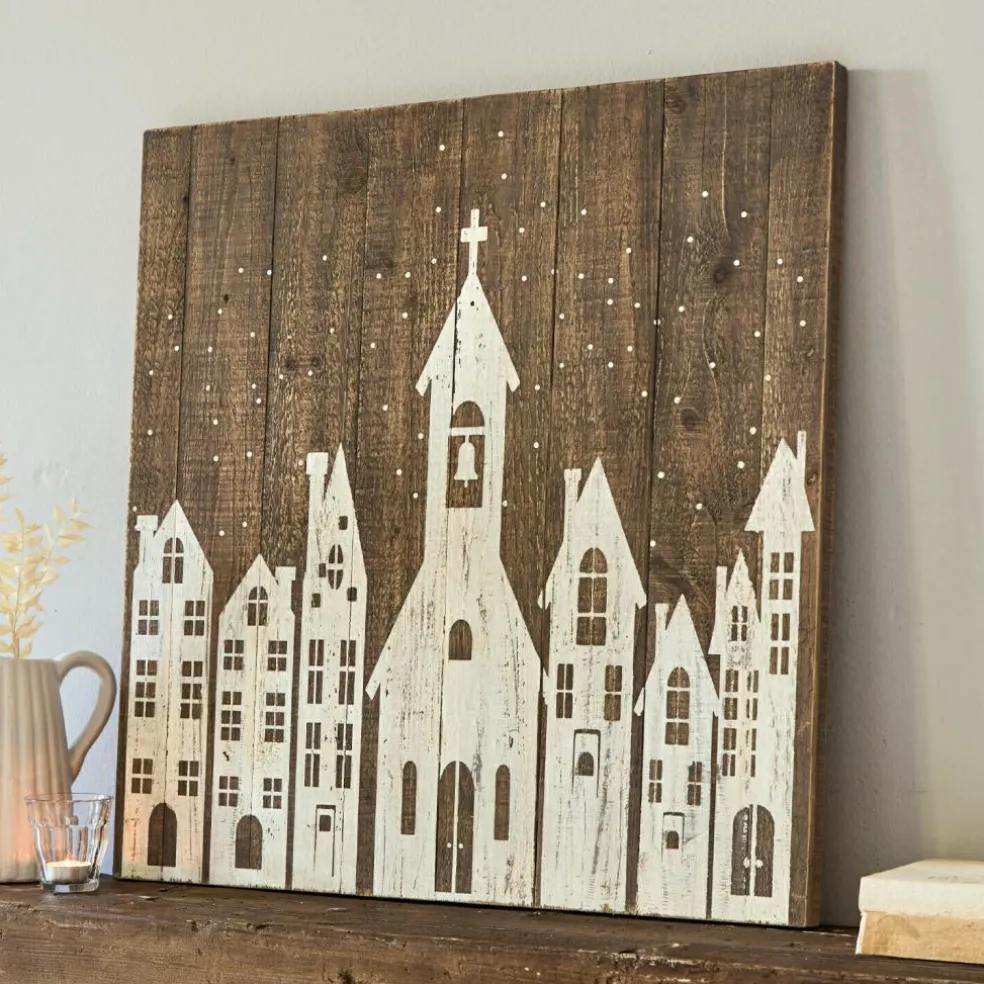 Besondere Wohnakzente machen das Weihnachtsfest noch ein bisschen schöner. Das gelingt Ihnen auch mit diesem handgefertigten Dekoboard, das wunderbar in ein Landhaus-Interieur passt. Das Motiv mit stilistisch schönen Häuserfassaden zieht alle Blicke auf sich. Und für das winterliche Flair dürfen die zart rieselnden Schneeflocken nicht fehlen. Als Basis für den Aufdruck dient edles Tannenholz, dessen Oberfläche mit einem rustikalen Finish versehen ist. Das Accessoire lässt sich dekorativ auf das Regal oder die Kommode stellen oder durch eine Zackenaufhängung an der Wand anbringen – im Flur, in der Küche oder im Wohnzimmer.