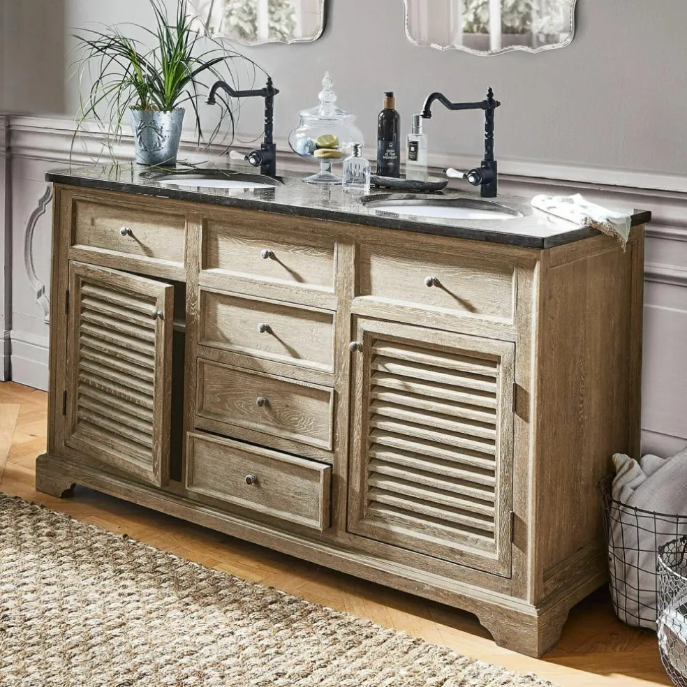 Der Waschtisch besticht mit seiner eleganten Erscheinung, einer schwarzen Natursteinplatte und mit einem handbearbeiteten Korpus aus massivem Eichenholz. Für ausreichend Stauraum sorgen drei geräumige Schubladen und zwei Fächer mit Lamellentüren. Die oberen drei Schubladen bilden die optische Blende für die beiden Keramik-Waschbecken. Diese wurden in die Steinplatte eingelassen und heben sich in strahlendem Weiß vom Rest des Möbels ab.