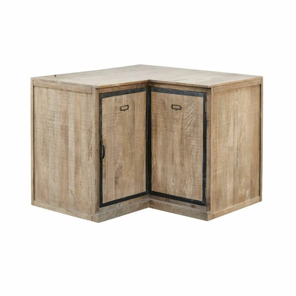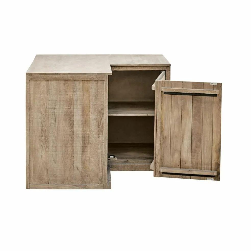 Gerade in einer Küche, in der Platz zum Arbeiten, Abstellen und viel Stauraum für Lebensmittel, Küchengeräte und Co gebraucht wird, kommt es auf jeden Zentimeter an. Deshalb gibt es Schränke, die über Eck gehen und so jeden Zentimeter nutzen – als Stauraum unter der Arbeitsplatte und als Ablagefläche über der Platte. Das Problem bei Eckschränken ist aber, dass ihr Innenraum oft nur schwer zugänglich ist. Deshalb sind wir stolz und glücklich, Ihnen einen Eckschrank präsentieren zu können, der mit einer absolut genialen Türlösung punktet. Denn hier können beide Türflügel gleichzeitig geöffnet werden, da sie miteinander verbunden sind. Das Ergebnis: Der Stauraum in diesem Eckschrank kann bis auf den letzten Zentimeter genutzt werden und Sie können die dort verstauten Utensilien auch bequem wieder herausholen. Von außen sieht der Eckschrank aus, als hätte er zwei einzelne Türen, die beide mit einem eisernen Zierrahmen akzentuiert sind. Wer aufmerksam hinschaut, wird aber entdecken, dass nur die linke Tür einen Griff hat. Aber auch optisch weiß der Eckschrank zu überzeugen, ist er doch sorgfältig aus massivem Mangoholz mit sägerauer Oberfläche gefertigt. Tipp: Zusammen mit anderen Küchenmodulen (21163, 21184, 21164, 21165) aus der gleichen Serie bildet der Eckschrank eine topfunktionale Küchenzeile (21186). Die passenden Hängeschränke erhalten Sie separat (2er Set: 21187, oder einzeln: 21167 & 21185).