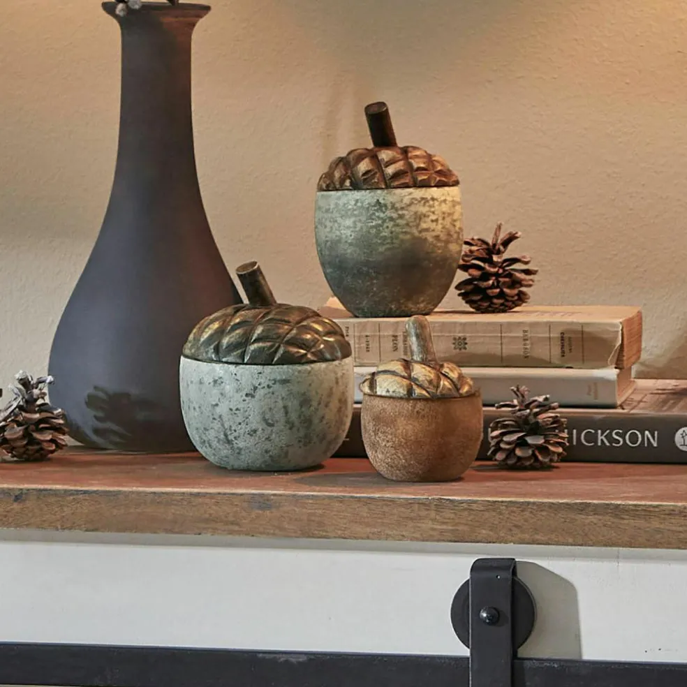 Diese Trio in drei Größen ist ganz bezaubernd und hat natürlichen Charme. Die Dosen haben einen Deckel in Form von Eicheln, der aus wertvollem Mangoholz besteht und von Hand geschnitzt ist. Das dicke Glas zeigt ein raues, interessantes Finish. Das Zusammenspiel von Glas und edlem Holz macht den speziellen Charakter dieser feinen Accessoires aus. Sie lassen sich bestens nutzen, um darin kleine Dinge zu verwahren, etwa Haarschmuck, Make-up oder Münzen. Im Bad könnten kleine Kosmetik-Utensilien hinein gelegt werden. Doch auch rein dekorativ machen sie sich sehr gut, vielleicht als naturnaher Schmuck auf dem Tisch oder im Regal platziert.