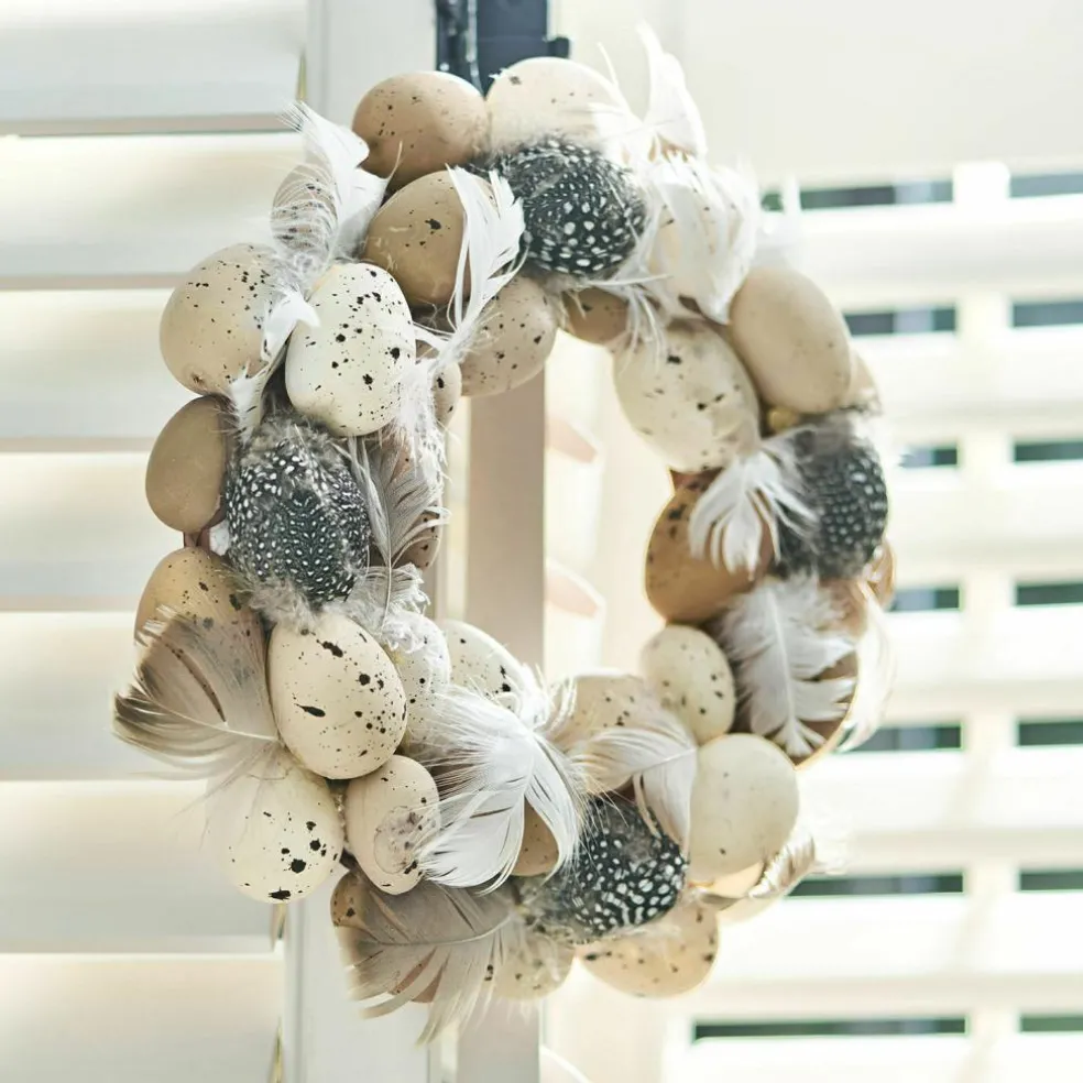 Dieser attraktive Osterkranz kombiniert bezaubernde Naturfedern mit hochwertigen Repliken, die echten Eiern täuschend ähnlich sehen. Die Eier erinnern optisch an süße, kleine Wachteleier mit unterschiedlichen Farbsprenkeln. Die rundum verteilten Hühnerfedern passen so einfach perfekt dazu und ergänzen auf die Weise einen wunderschönen Osterkranz. Das handgearbeitete Schmuckstück ist die perfekte Frühlingsdekoration für Türen, Wände und Fenster. Die Eier sind nicht bunt bemalt, sondern in einer naturbelassenen Optik gehalten. Dadurch wirkt der Kranz sehr dezent, stilvoll und unaufdringlich. Er fügt sich also nahtlos in bereits bestehende Oster-Dekorationen ein, ohne anderen Accessoires die Show stehlen zu wollen.
