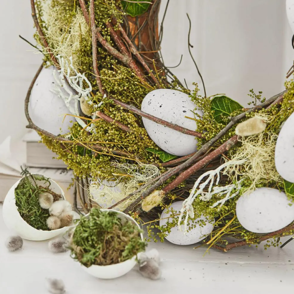 Suchen Sie nach einer stilvollen und natürlich schönen Art, Ostern zu zelebrieren? Dann ist dieser wunderschöne Osterkranz genau das Richtige für Sie. Er besteht aus einem Arrangement echter Naturmaterialien wie Birkenzweigen, Moos und Borstenhirse. Diese wurden mit getupften Kunsteiern kombiniert, die täuschend echt aussehen und deutlich widerstandsfähiger sind als echte Eierschalen. Hängen Sie den Osterkranz an Türen, Wänden und Fenstern in Innenräumen oder überdachten Außenbereichen auf, um eine einladende Atmosphäre zu schaffen. Mit diesem Kranz holen Sie sich die Schönheit des Frühlings in Ihr Zuhause und die hübschen Farben passen zu jeder Einrichtung!