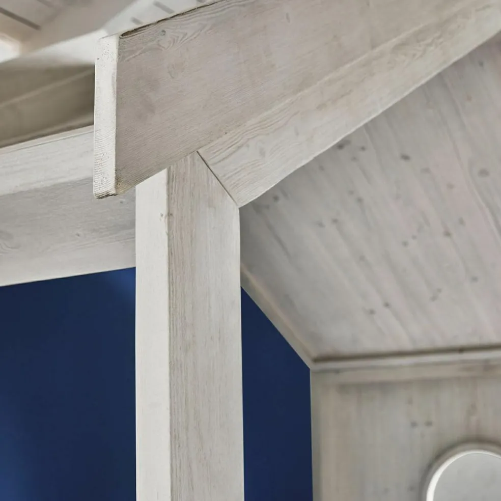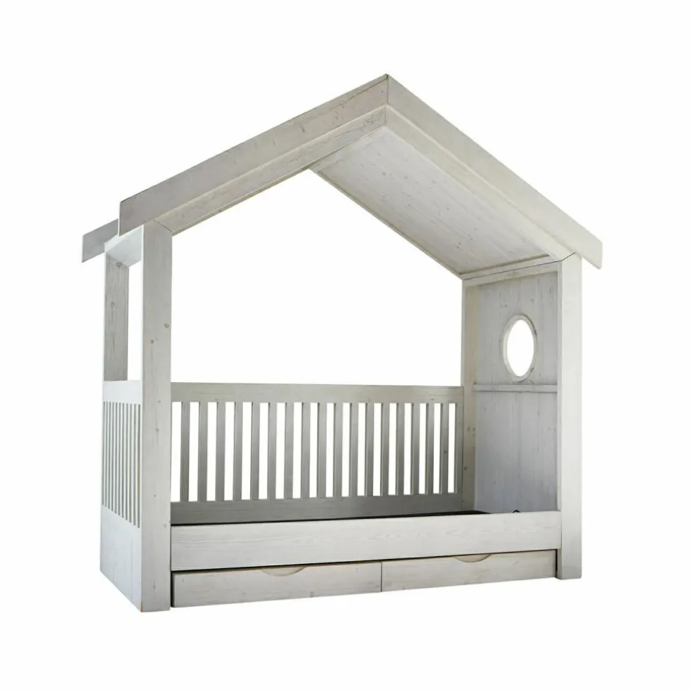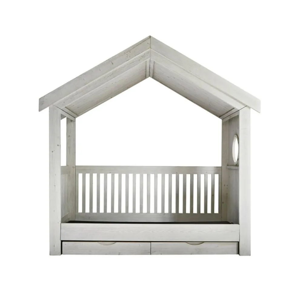Ein Bett, das mehr ist als nur ein Schlafplatz – dieses Häuschen in Bettform weckt Fantasie, lädt zum Kuscheln ein und bietet zugleich durchdachten Stauraum. Das helle, sanft lackierte Tannenholz zeigt bewusst seine lebendige Maserung und charmante Astaugen – so bleibt die natürliche Schönheit des Materials spürbar erhalten. Die offene Giebelkonstruktion schafft ein Gefühl von Raum und Geborgenheit zugleich, fast wie ein eigenes kleines Zuhause im Zimmer. Besonders praktisch: Unter dem Bett verbergen sich zwei große Schubladen mit formschönen Muldengriffen – perfekt für Bettwäsche, Bücher oder Spielzeug. Die Matratze (nicht im Lieferumfang enthalten) liegt auf einer festen Holzkonstruktion, sodass auch ein Lattenrost nicht benötigt wird. Ein stilvoller Rückzugsort, der Kindern Freiraum lässt und Eltern durchdachtes Design bietet.