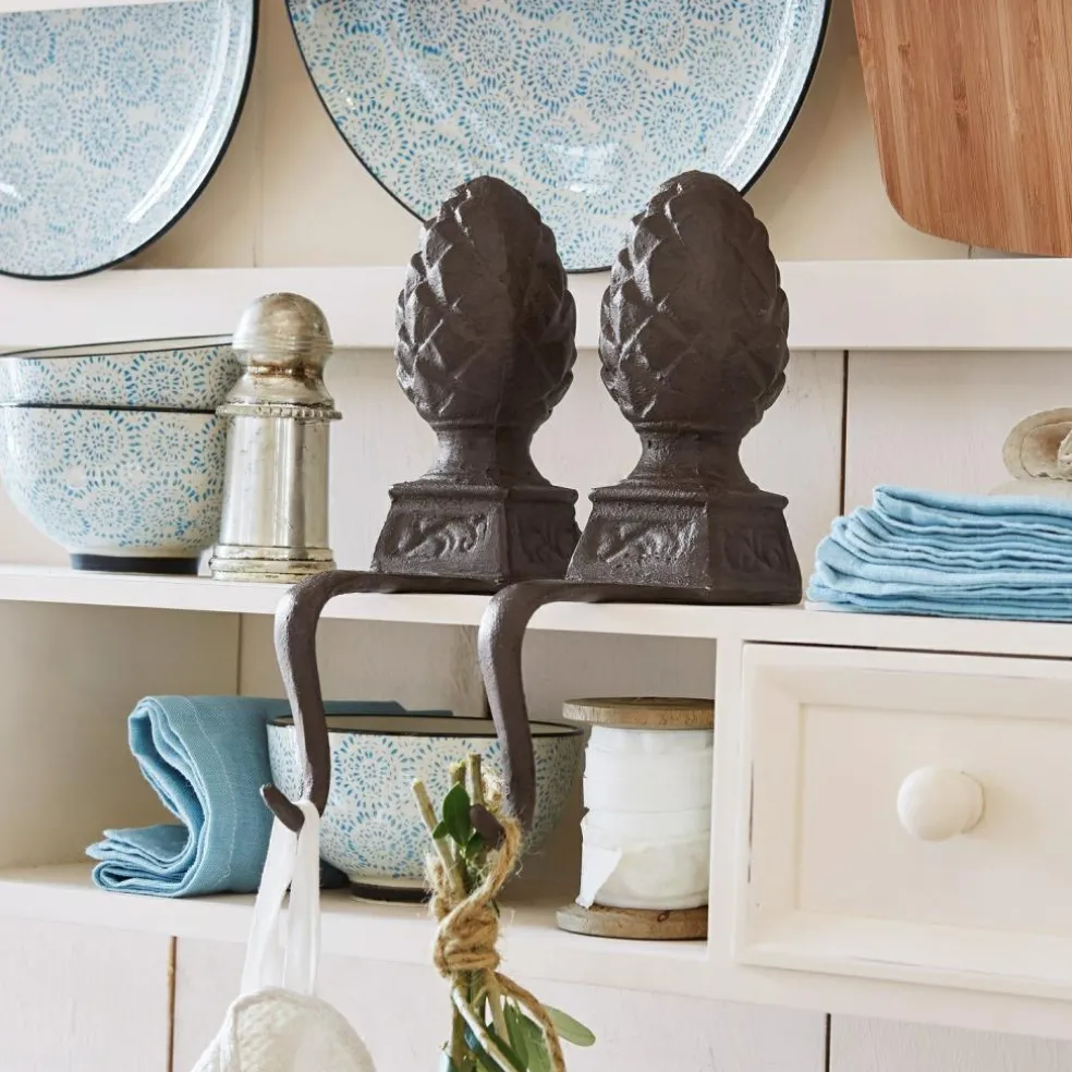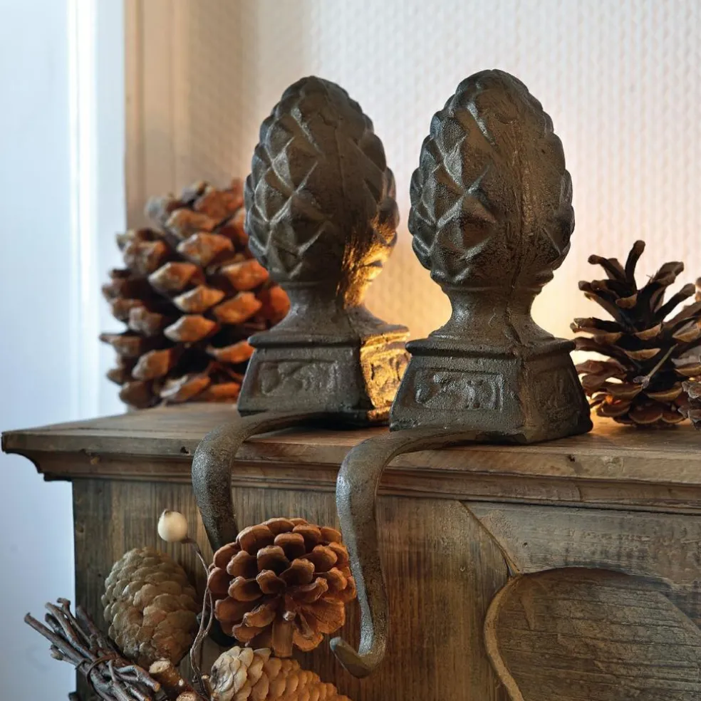 Das 2er Set besteht aus eisernen Pinienzapfen im Antik-Look, jeweils mit einem über eine Kante laufenden, praktischen Haken versehen. Unser Tipp: Dekorieren Sie die eisernen Schwergewichte auf dem Kaminsims, einer Kommode oder jeweils an den Seiten eines halbhohen Schrankes oder Regals. An den Haken können Sie dann beispielsweise einen Weihnachtsstrumpf, einen hübschen Strauß Trockenblumen oder auch Ihr Schlüsselbund aufhängen. Reicht das Gegengewicht der Zapfen aus Gusseisen nicht mehr aus um das Anhängsel zu tragen, können Sie die Haken auch ganz einfach mit einem Nagel oder einer Schraube an ihrem Platz befestigen. Das Tolle an diesen massiven Kunstwerken: Selbst ohne tragende Rolle haben die beiden ihre Daseinsberechtigung, denn sie sind einfach ein toller Hingucker.