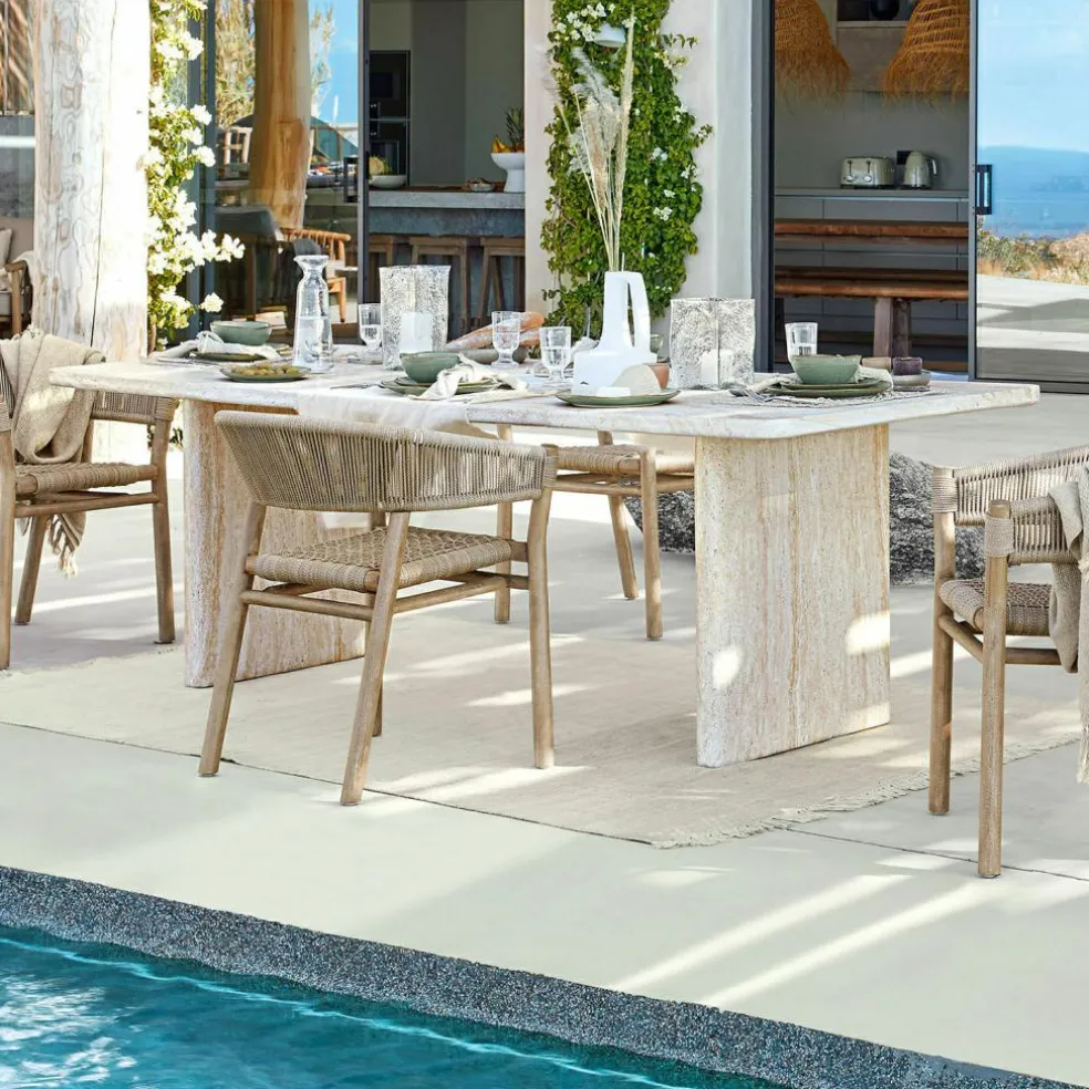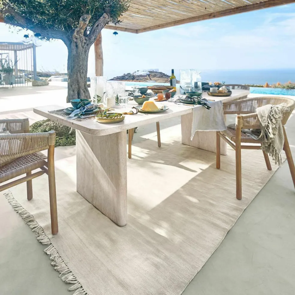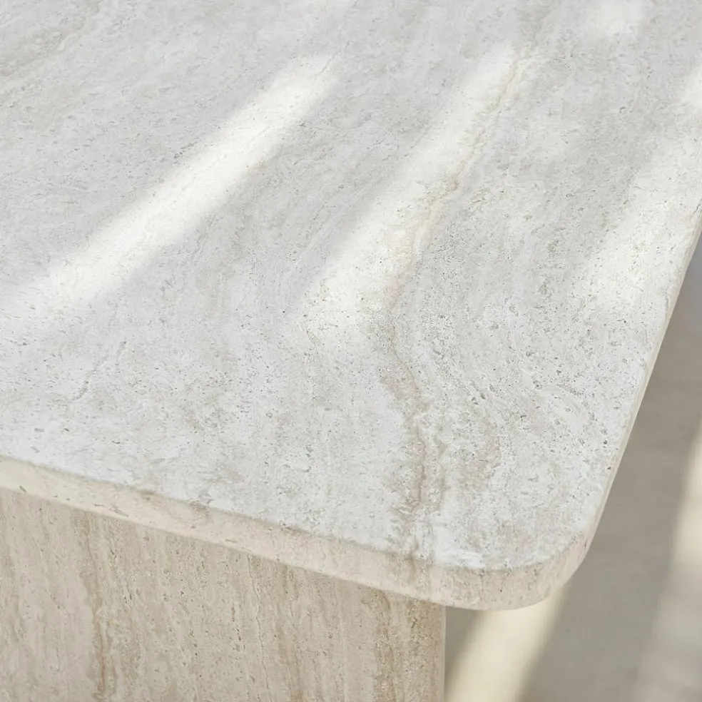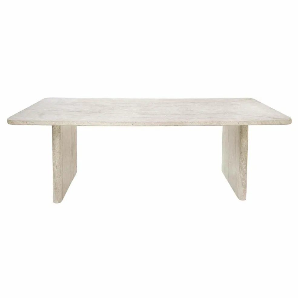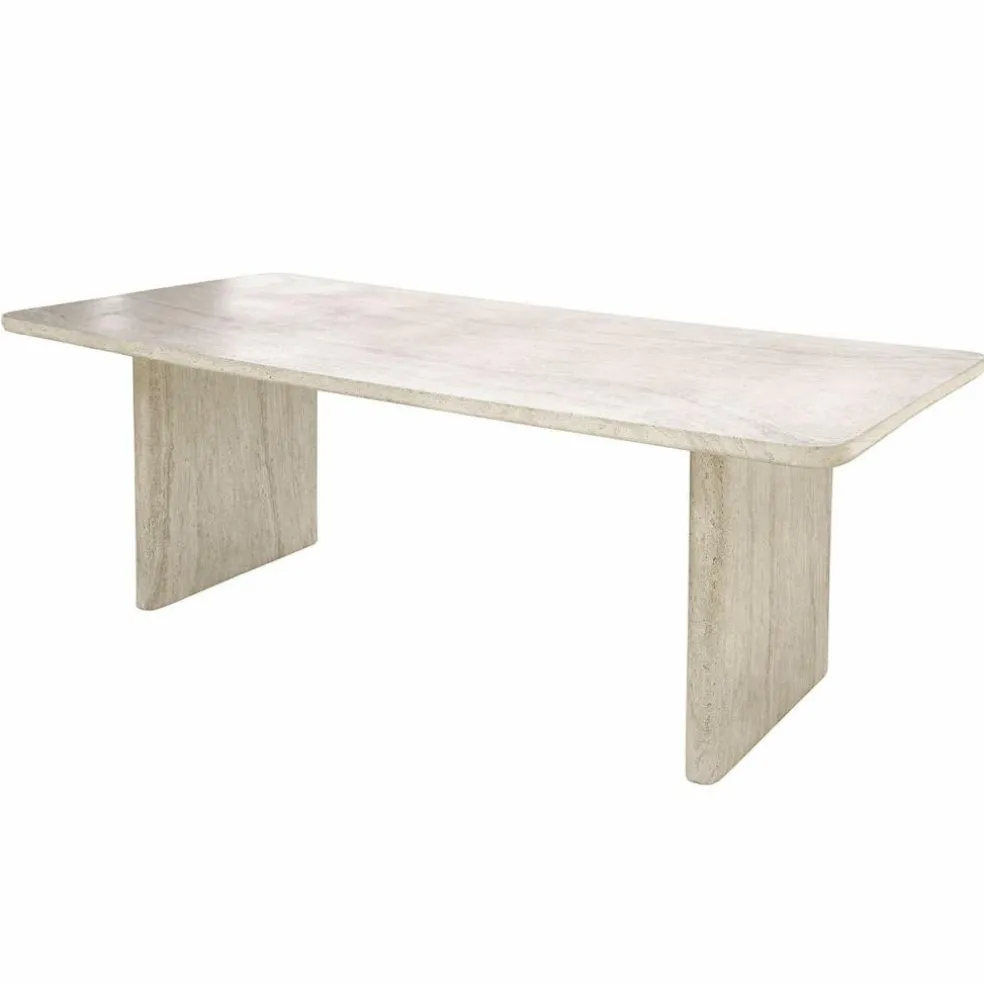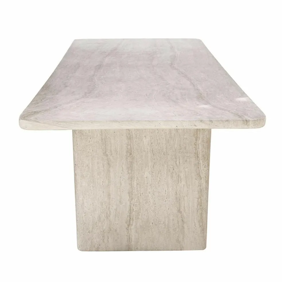 Mit diesem Esstisch wird jeder Raum zu einer besonderen Oase des Stils. Die Travertin-Optik bringt das Flair mediterraner Landschaften direkt ins Zuhause und überzeugt mit einem authentischen Look, der den Charme natürlichen Steins widerspiegelt. Die Betonoberfläche zeigt sich in zarten Beige- und Creme-Tönen, durchzogen von einzigartigen Maserungen, die jedes Stück zu einem Einzelstück machen. Ob im Esszimmer oder in einer lichtdurchfluteten Küche – dieser Tisch ist mehr als nur Möbelstück, er ist ein Statement. Seine Oberfläche ist strapazierfähig und pflegeleicht, ohne die ästhetische Wirkung der naturgetreuen Steinoptik zu verlieren.