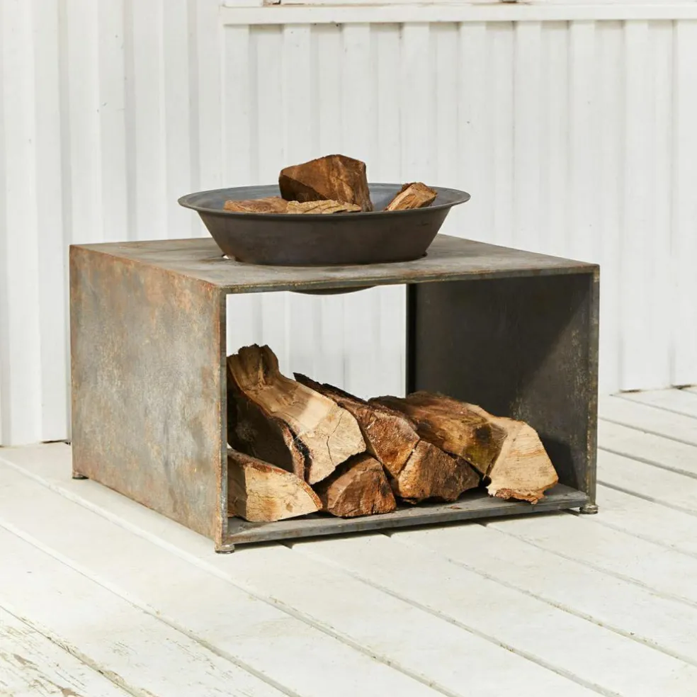 Lust auf knisternde Lagerfeuer-Stimmung im eigenen Garten? Dann entzünden Sie an kühlen Abenden die Holzscheite in dieser Feuerschale und genießen die wohlige Wärme, das faszinierende Spiel der Flammen und die spannende Atmosphäre, die wirklich jeden unwiderstehlich in ihren Bann zieht. Neben dem stimmungsvollen Effekt der gemütlich knackenden Holzscheite überzeugt diese Feuerschale aber auch mit ihrem modern-cleanen Design. Über dem an zwei Seiten offenen Kubus, der sich als Lagerplatz für das Feuerholz anbietet, befindet sich eine Schale, die bei Bedarf abnehmbar ist. Ebenso faszinierend wie das schlichte Design ist auch das Material. Die Feuerschale wurde aus massivem Eisen gefertigt und mit einem Antik-Finish veredelt, als hätte sie schon viele, viele Jahre unter freiem Himmel verbracht. Und auch den nächsten Jahren und Jahrzehnten sieht sie mit Gelassenheit entgegen.