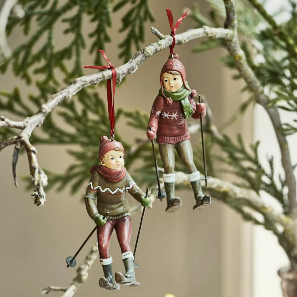 Zuckersüß, diese beiden detailverliebten, kleinen Skifahrer aus Polyresin. Sie sind aufwendig handbemalt und bezaubern mit hübschen Details – vom Schal über die Handschuhe bis zu den Skiern, alles ist fein ausgearbeitet. Ein Band zur Aufhängung ist schon dabei, sodass Sie gleich mit dem Dekorieren beginnen können. Schmücken Sie den Weihnachtsbaum, eine Girlande oder Winterzweige mit dem niedlichen Duo und freuen Sie sich über nostalgisches Flair. Träumen wir uns mit ihnen zurück in die Weihnachtszeit vergangener Zeiten und lassen uns bei diesem Anblick auf Puderzucker-Schneepisten und in gemütliche Berghütten entführen. Ein charmantes Doppel zum Fest, das auch gut mit weiterer Dekoration wie Zapfen und Kugeln harmoniert. Zu Weihnachten oder auch den ganzen Winter über sind sie eine Freude.