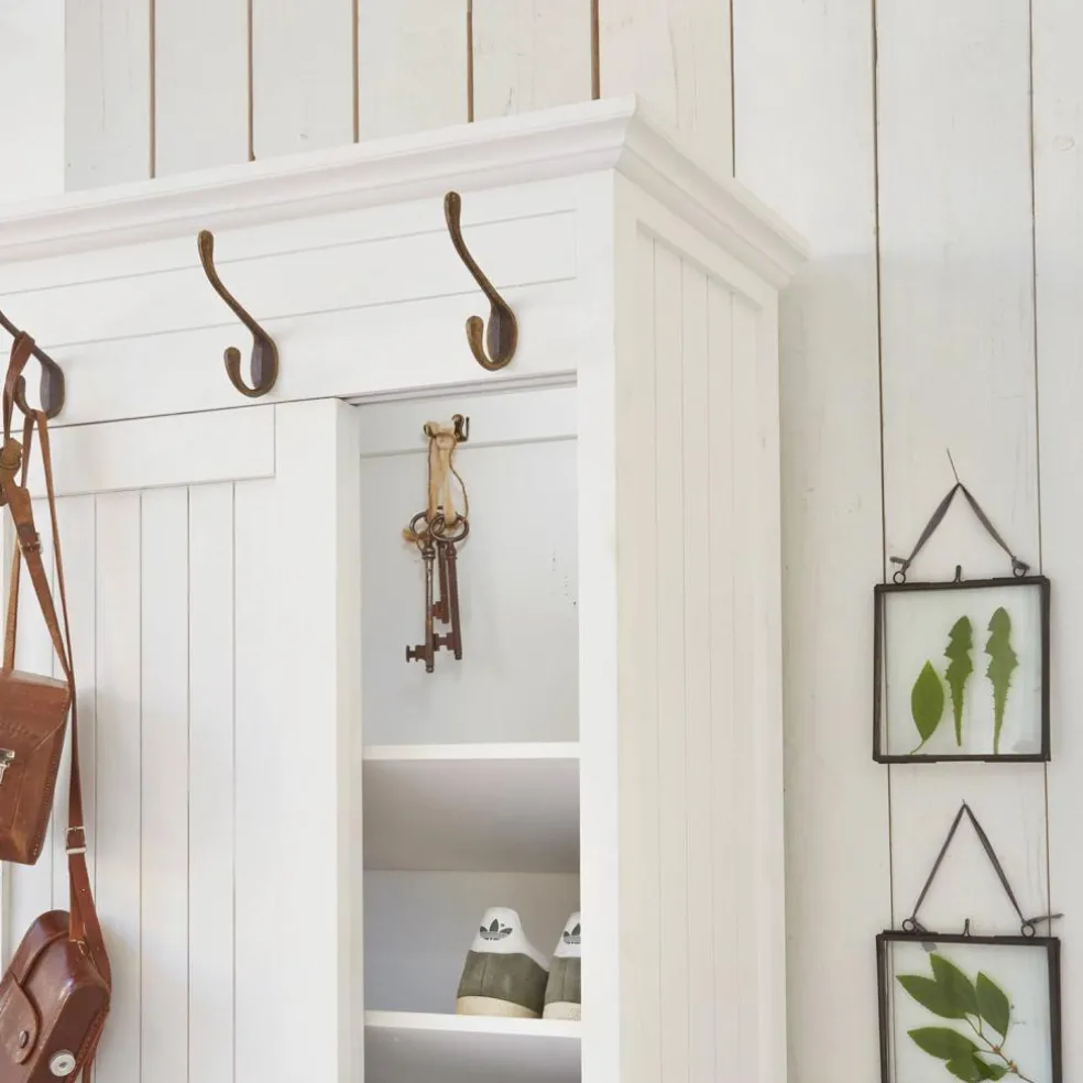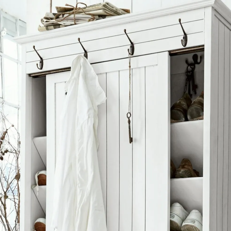 Der perfekte Garderobenschrank sollte nicht nur ein paar Türen und Ablagen bieten, sondern auch ausreichend Kleiderhaken und abgeschrägte Schuhfächer. Genau wie unser Modell, welches äußerst smart konzipiert wurde. Damit der Schrank auch in schmalen Räumen sein volles Potential entfalten kann, sind keine Klapptüren, sondern Schiebetüren integriert. Da Funktionalität nicht alles ist, wurde natürlich auch auf ein besonders attraktives Design wertgelegt. Eine wunderschöne Lattenoptik, charmante Farbkontraste und eine hochwertige Verarbeitung machen diese Garderobe nicht nur für Anhänger des Long Island-Stils zur ersten Wahl.