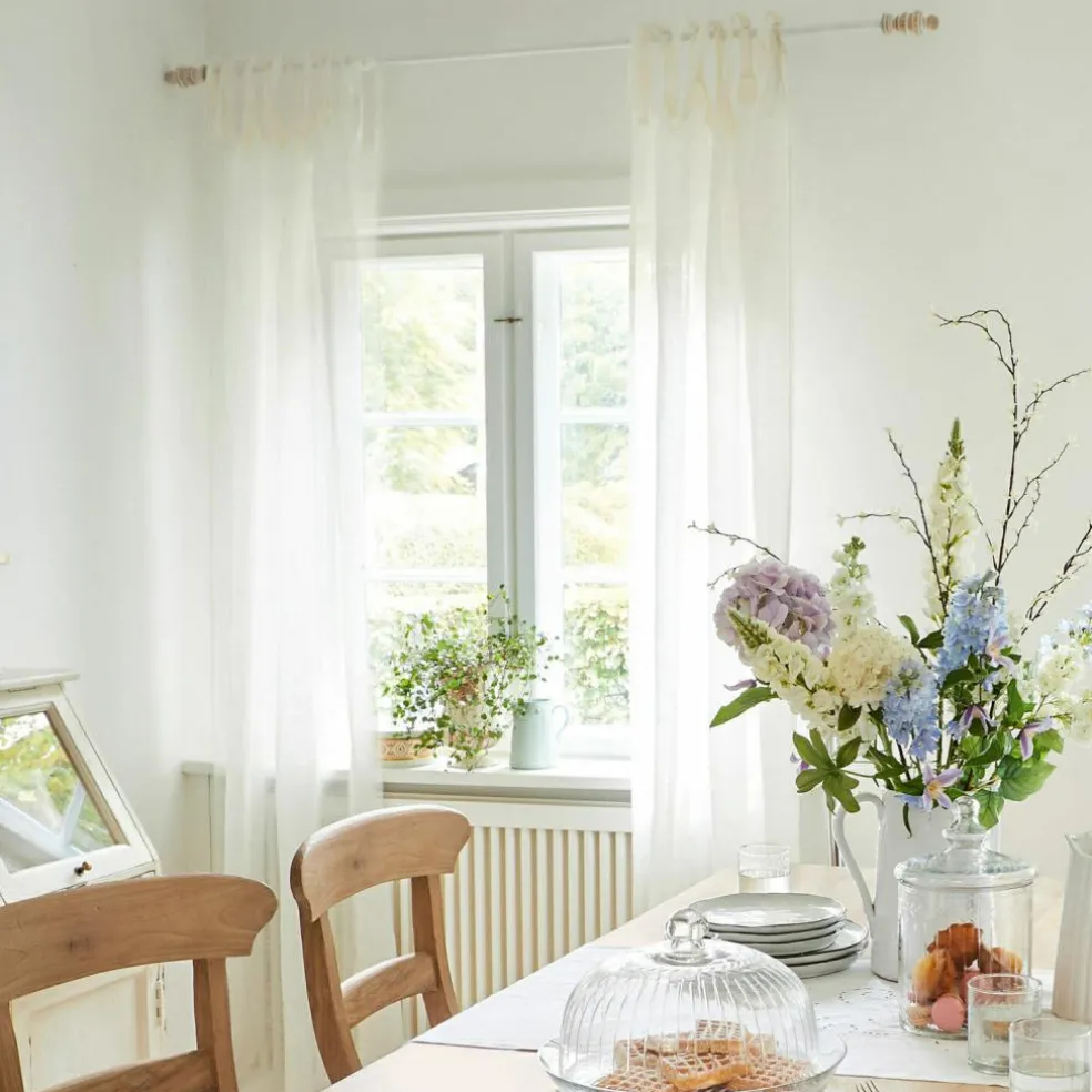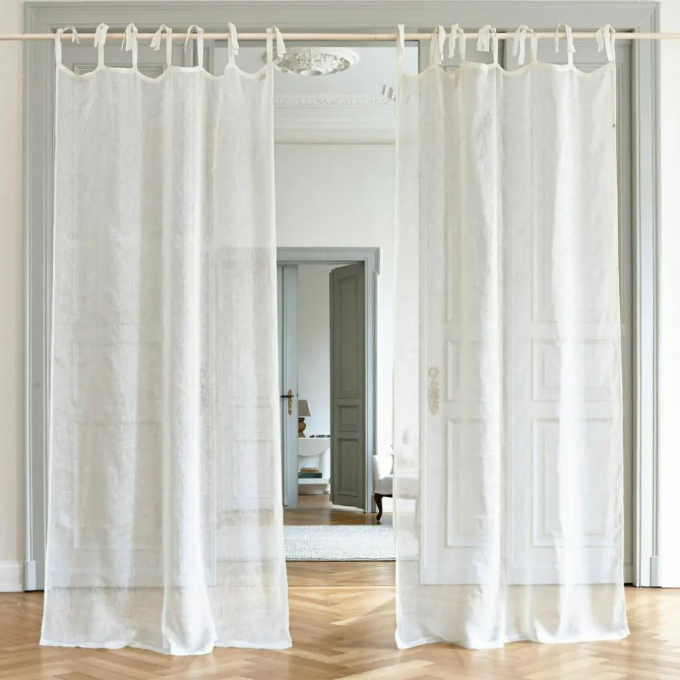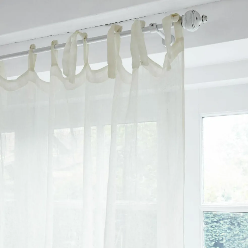 Die cremefarbene Gardine aus reinem, lichtdurchlässigen Leinen passt sich problemlos allen Einrichtungsstilen an. Die offenen Bindebänder helfen beim einfachen Befestigen an jeder Gardinenstange und fungieren darüber hinaus als dezent-verspieltes Stilelement.