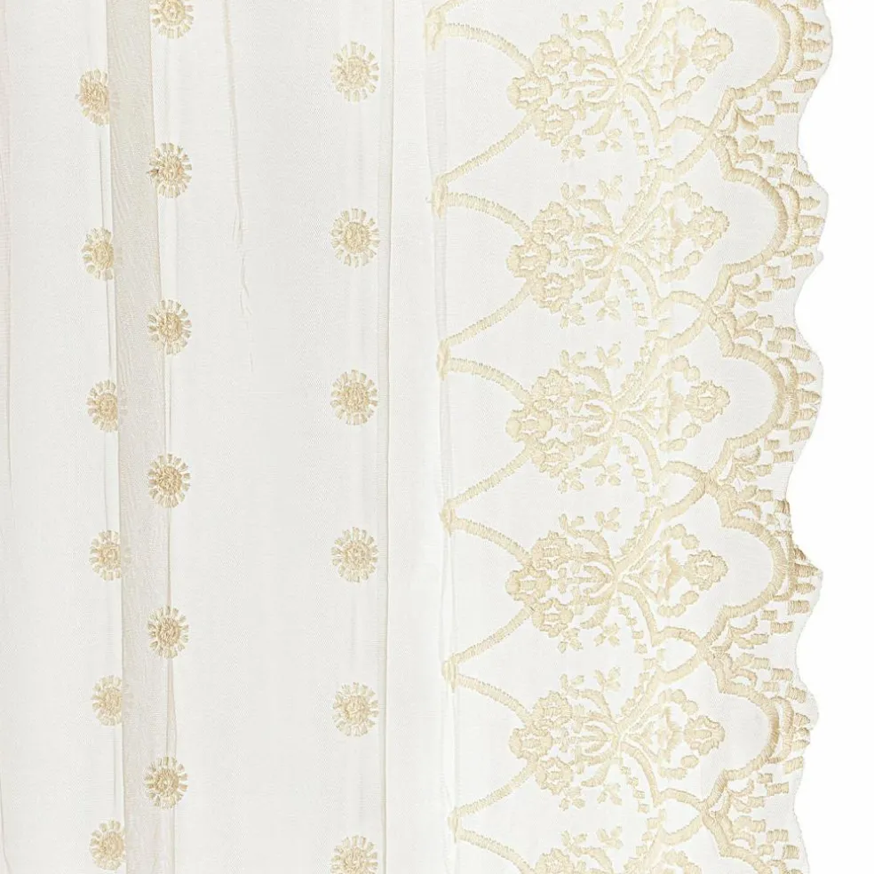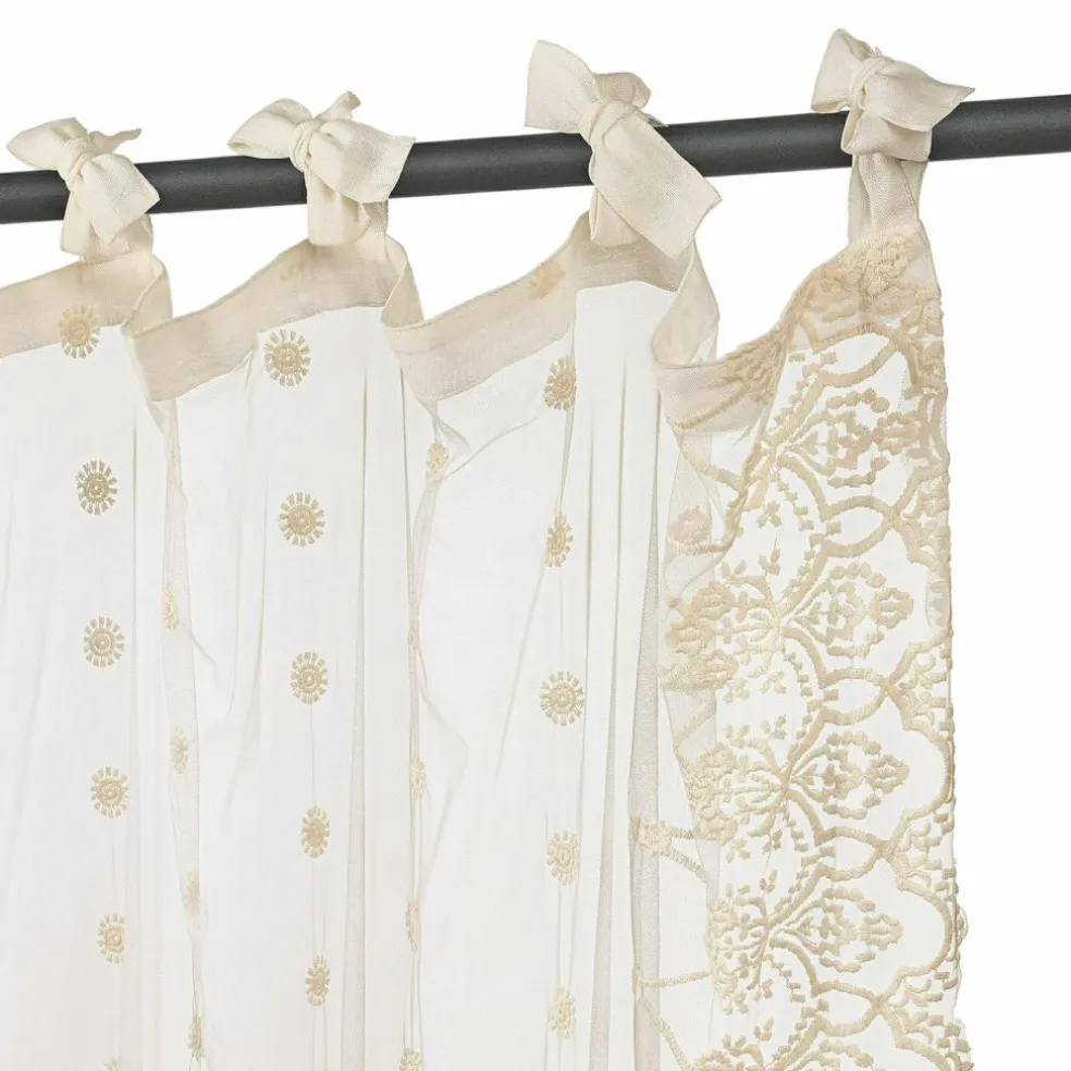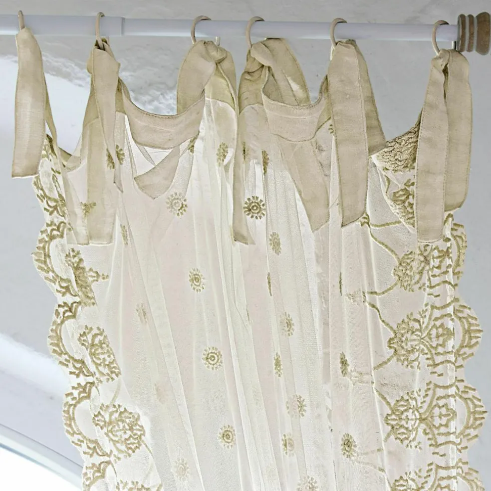 Diese edle Gardine ist zum Verlieben schön und lässt romantische Herzen höher schlagen. Vor allem der feine Spitzenstoff mit stilisierter Blütenstickerei verbreitet Leichtigkeit und nostalgischen Charme – ergänzt durch die gebogten Längskanten mit filigraner Bordürenstickerei, die dem Textil einen schmückenden Abschluss verleihen. Das hochwertige Gewebe ist zart und duftig, so dass das Tageslicht angenehm hell in den Raum fällt, trotzdem schützt es vor greller Sonne und neugierigen Blicken. Die Aufhängung durch Bindebänder unterstreicht den romantischen Look – zugleich kann die Gardine auch in der Länge individuell angepasst werden. Ein traumhafter Wohnakzent, der eine unbeschwerte und feminine Atmosphäre versprüht – und vor dem offenen Fenster zauberhaft mit dem Wind spielt. Am schönsten harmoniert die Spitzengardine mit dem Shabby-Chic.