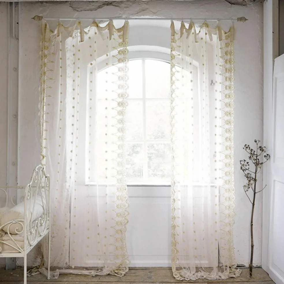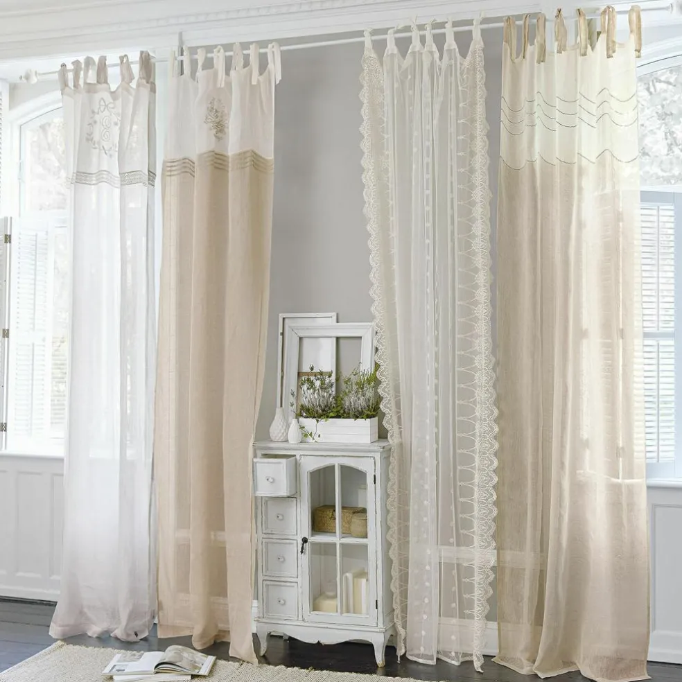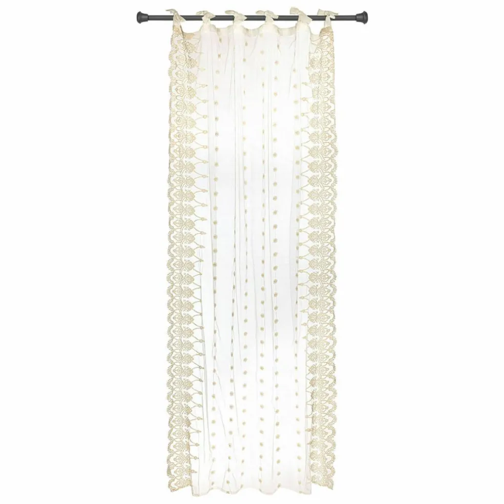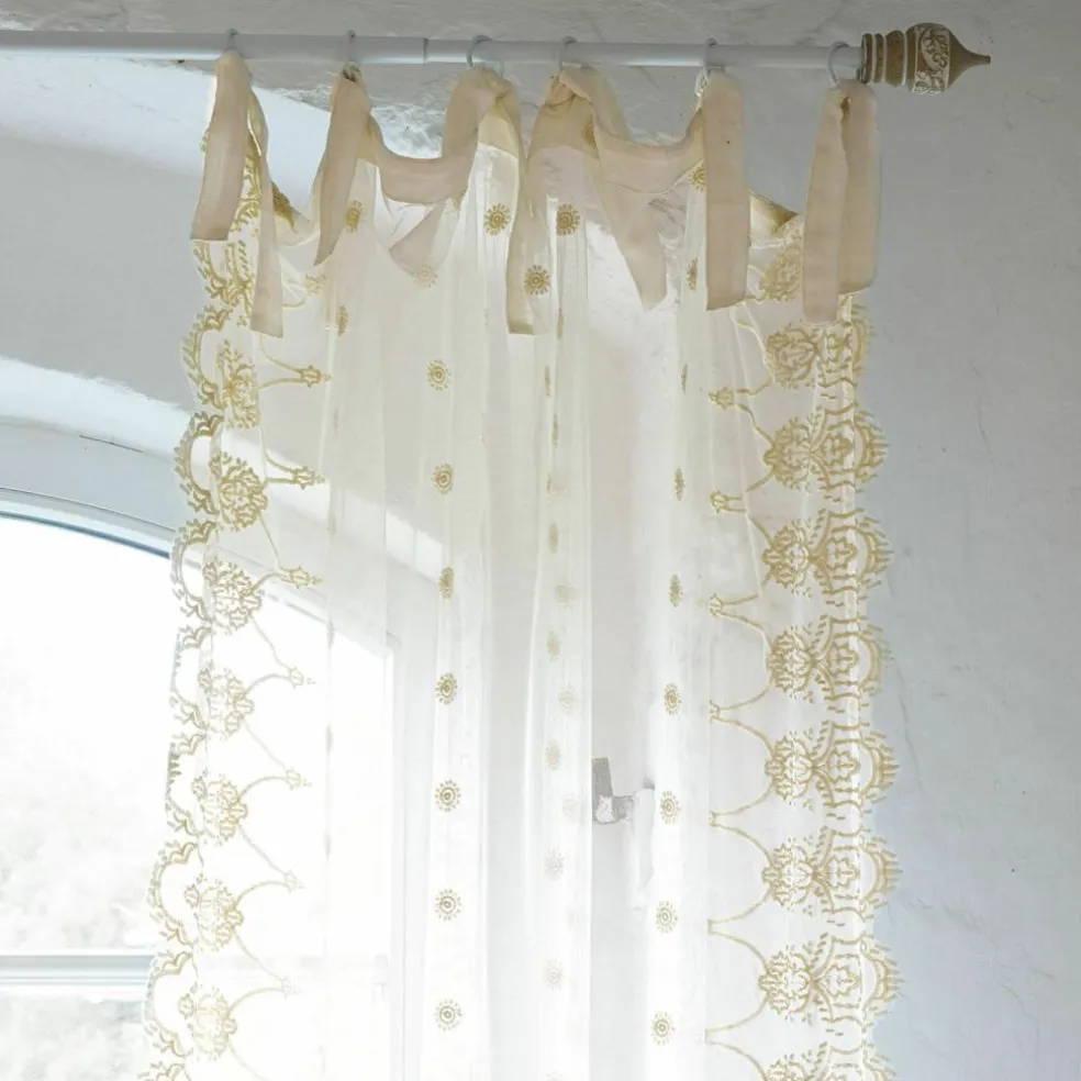 Diese edle Gardine ist zum Verlieben schön und lässt romantische Herzen höher schlagen. Vor allem der feine Spitzenstoff mit stilisierter Blütenstickerei verbreitet Leichtigkeit und nostalgischen Charme – ergänzt durch die gebogten Längskanten mit filigraner Bordürenstickerei, die dem Textil einen schmückenden Abschluss verleihen. Das hochwertige Gewebe ist zart und duftig, so dass das Tageslicht angenehm hell in den Raum fällt, trotzdem schützt es vor greller Sonne und neugierigen Blicken. Die Aufhängung durch Bindebänder unterstreicht den romantischen Look – zugleich kann die Gardine auch in der Länge individuell angepasst werden. Ein traumhafter Wohnakzent, der eine unbeschwerte und feminine Atmosphäre versprüht – und vor dem offenen Fenster zauberhaft mit dem Wind spielt. Am schönsten harmoniert die Spitzengardine mit dem Shabby-Chic.