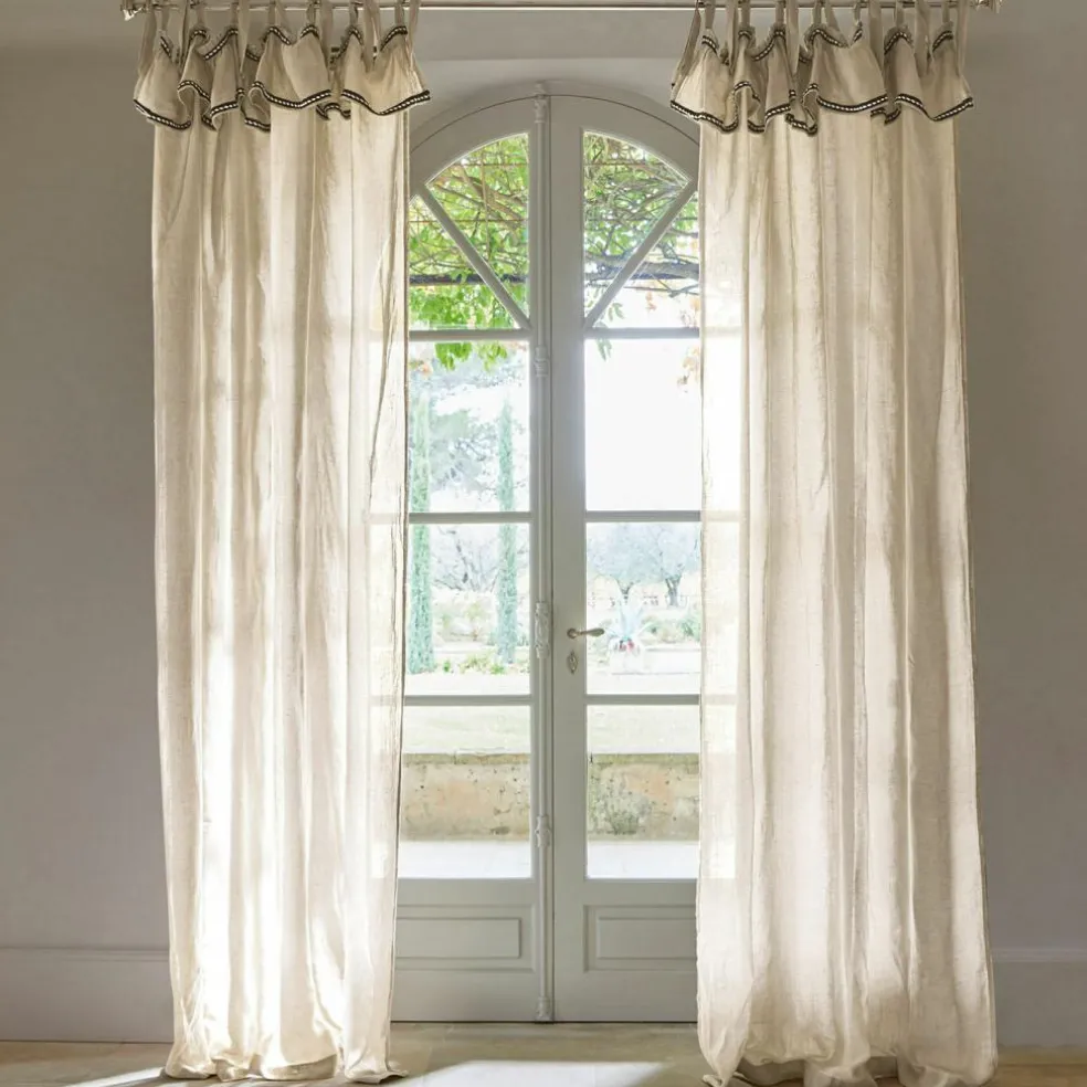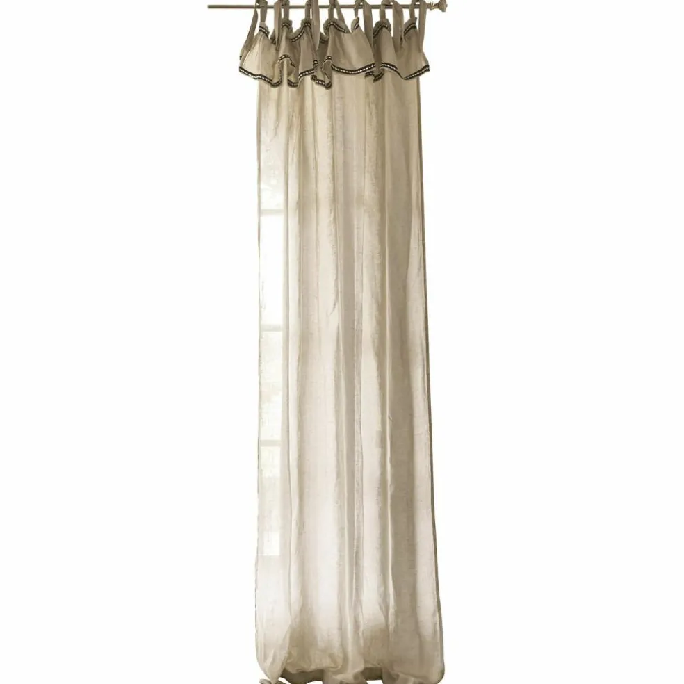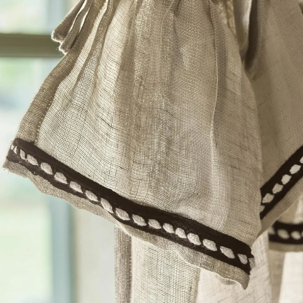 Suchen Sie nach einer Gardine, die nicht nur nützlich, sondern auch dekorativ ist? Diese Gardine erfüllt beides. Der breite Rüschensaum in Form eines breiten Volants, umgeben von schwarzen Zierstreifen mit eingezogenen, weißen Fäden, verleiht Ihrem Raum einen zauberhaften und außergewöhnlichen Look. Der dunkle Zierstreifen ähnelt in seiner Optik fast einer Perlenschnur. Hergestellt aus Baumwolle und Leinen und mit sieben Bindebändern versehen, passt sie ideal zum Landhausstil, aber auch perfekt in jede andere Einrichtung. Schaffen Sie ein schönes Ambiente in Ihrem Zuhause und genießen Sie den stilvollen Luxus dieses edlen Schmuckstücks!