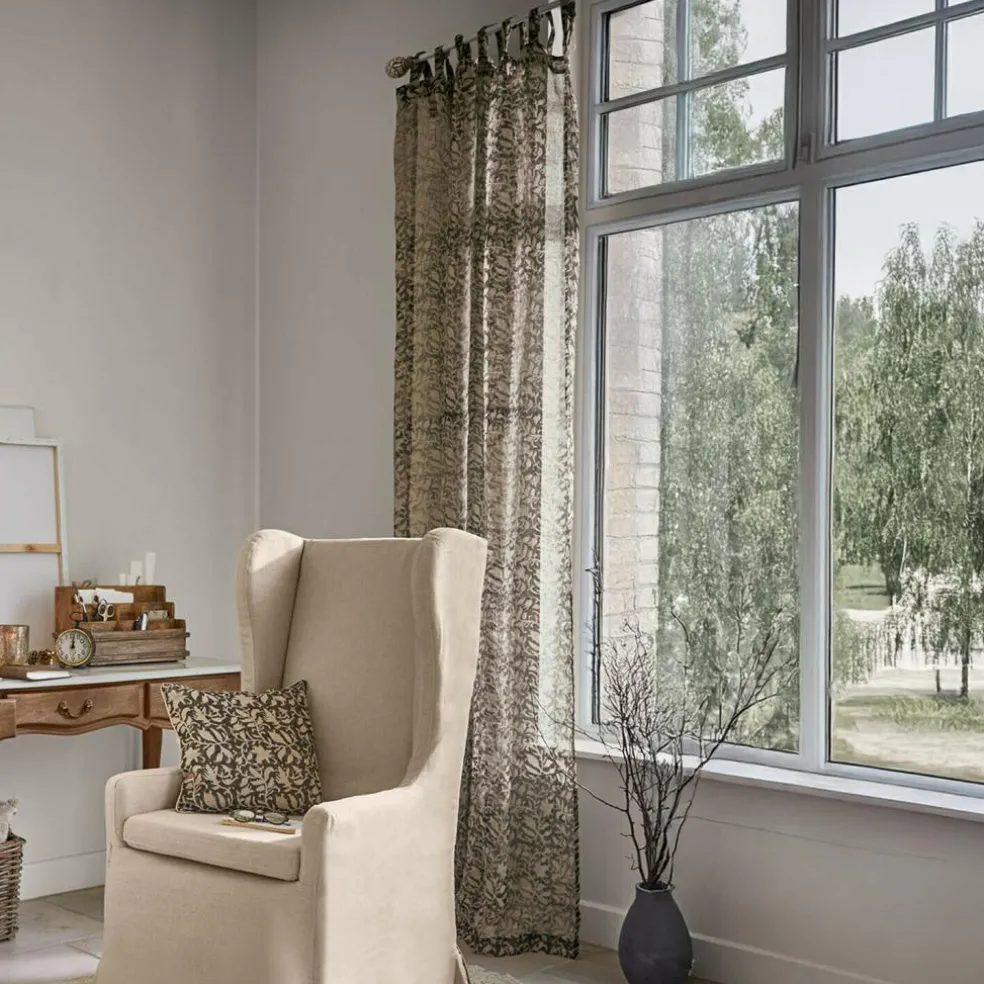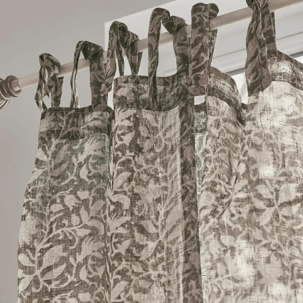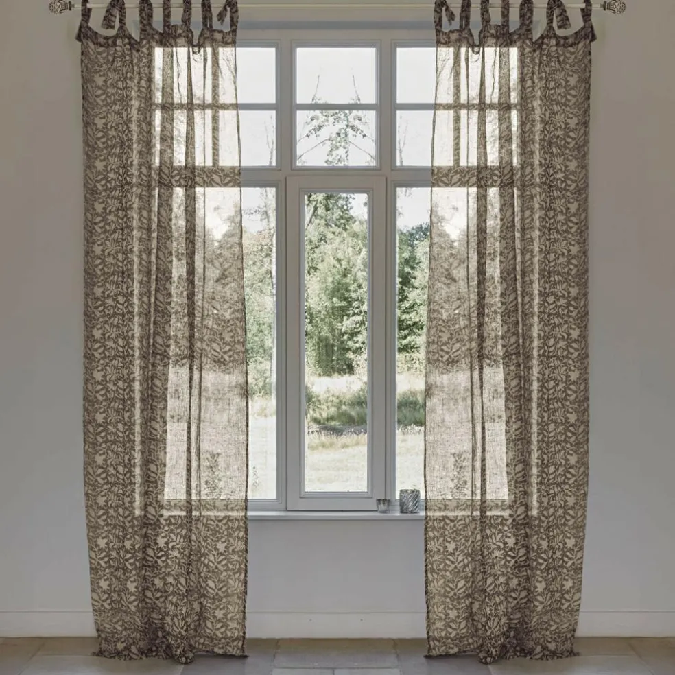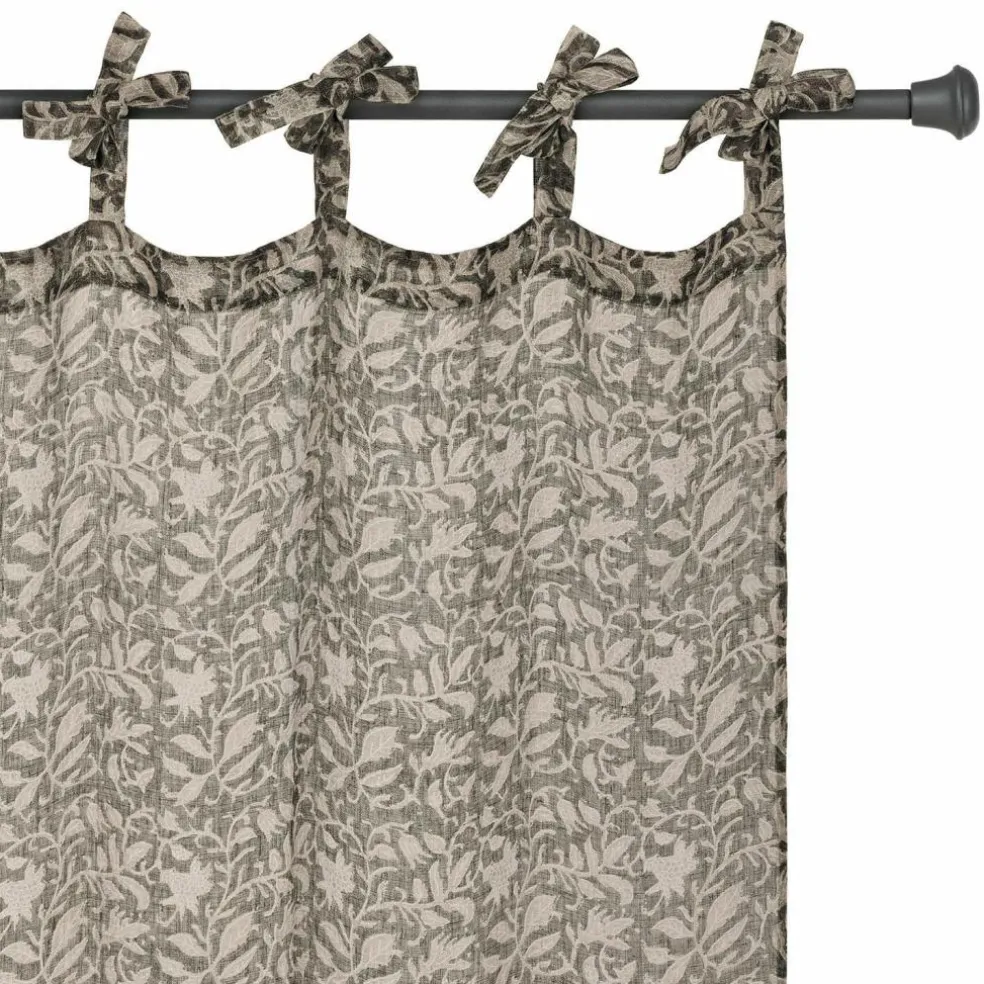 Ein Hauch rustikaler Poesie zieht mit dieser Leinen-Gardine in Ihr Zuhause ein. Die leicht transparente Struktur des natürlichen Leinens bringt eine besondere Lebendigkeit in den Stoff – unterstützt vom kontraststarken blättrigen Design, das sich wie ein Schattenriss über das Gewebe legt. Durch die Bindebänder wirkt der Vorhang bewusst lässig und lässt sich variabel drapieren – mal locker, mal kunstvoll geschlungen. Ideal für Räume, die Persönlichkeit und Tiefe ausstrahlen sollen.