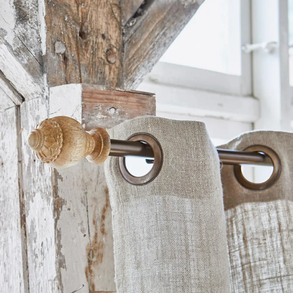 Auf den kleinen Details liegt in einer gelungenen Einrichtung das Augenmerk. Kein Wunder also, wenn diese herrlich verzierte Gardinenstange das Ambiente elegant aufwertet. Der Gardinenknauf ist aus solidem Mangoholz gefertigt. Detailverliebt wurden filigrane Schnitzereien ausgearbeitet. Probieren Sie es aus: In Kombination mit einer cremefarbenen Leinengardine wird die schwarze Gardinenstange zu einem eleganten Kontrastgeber. Auch farbprächtige Gardinen funktionieren wunderbar im Zusammenspiel mit dem verzierten Holzknauf und erinnern an den Boho-Stil. Für den charaktervollen Landhaus-Look ist die Gardinenstange mit dem Knauf aus Holz nahezu ein Must-have. Sie können beispielsweise das Schmuckstück im Wohnzimmer oder im Schlafzimmer anbringen. Sehr praktisch: Die Eisenstange ist bis auf 2,24 m ausziehbar.