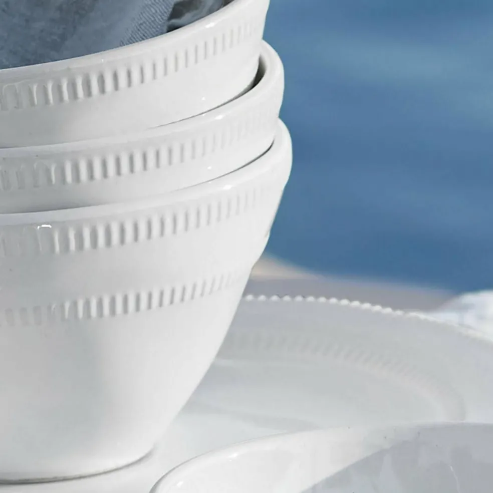 Ob beim Frühstück in der Morgensonne oder beim Mittagsimbiss in Ihrem Balkon-Bistro, ob Nachmittags-Snack oder stilvolles Dinner am Abend – das Geschirr 12er Set wird mit seinem dezenten Weiß und der hochglänzenden Lasur Ihre kulinarischen Köstlichkeiten besonders appetitlich wirken lassen. Gleichzeitig begeistert es mit seiner ausgezeichneten Alltagstauglichkeit. Das Geschirr Set ist ein traditionelles Handwerksprodukt aus Steinzeug, das sorgfältig von Hand getöpfert und mit einem dezent geriffelten Rand verziert wurde, der jedem Teil den individuellen Charakter verleiht. Es besteht aus je vier großen Tellern für Hauptspeisen, vier kleineren Tellern und 4 Schüsseln, in denen Sie Suppe oder Salat servieren können, die sich aber auch für Müsli, Obstsalat, Oliven oder Knabbereien eignen. Deshalb sind wir sicher, dass dieses Geschirr oft Ihre Landhaus-Tafel krönen wird. Zumal alle Teile mikrowellengeeignet sind und in der Spülmaschine gereinigt werden können.