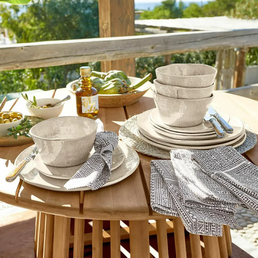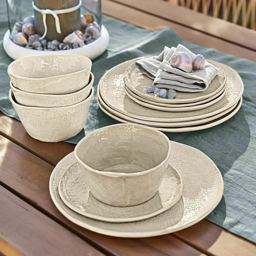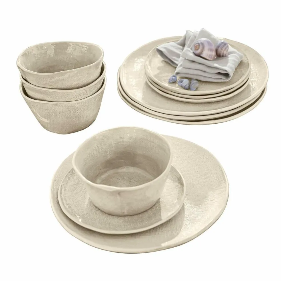Lassen Sie sich von der authentischen Schönheit dieses 12er Geschirrsets aus handgefertigtem Steinzeug verzaubern. Jedes Stück, sorgfältig von Hand geformt und vollendet, ist eine Feier der Keramikkunst, die Ihre Tafel mit einer unvergleichlichen Note von handgemachter Wärme schmückt. Die sanft gewellten Ränder und die subtilen Texturunterschiede laden zum Berühren ein und machen jede Mahlzeit zu einem sensorischen Erlebnis. Die Beständigkeit des Materials garantiert, dass dieses Set Sie durch alltägliche Momente und Feste des Lebens begleiten wird, während das durchdachte Design und die Funktionalität dieses Geschirrs es zum unverzichtbaren Begleiter in Ihrer Küche machen.