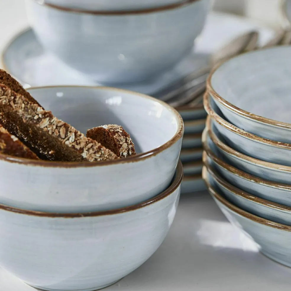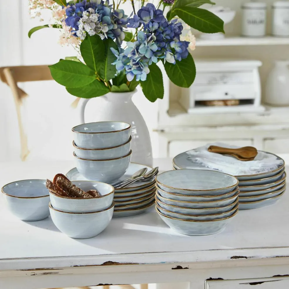 Früher hieß es “Das Auge isst mit“, was bedeutete, dass nicht nur die Speisen köstlich sein sollten, sondern auch ihre Präsentation appetitlich bis kunstvoll. Heute rückt mehr und mehr auch das Geschirr selbst ins Blickfeld, das sichtbares Zeichen für den individuellen Lebensstil ist. Ein Anspruch, den dieses Geschirr 24er Set aus hochwertigem Steinzeug par excellence erfüllt. Als traditionelles Handwerksprodukt wurde es sorgfältig gefertigt und die kleinen Unebenheiten geben dem Geschirr die individuelle Note, die es so wohltuend von Industrieprodukten unterscheidet, während das von Hand bemalte blaue Dekor an den Himmel an einem schönen Frühlingsmorgen erinnert. Landhaus-Feeling pur! Sie erhalten im Set 6 x einen großen und einen kleinen Teller, eine Schüssel und eine Bowl, die sich für Joghurt, Müsli oder Salat eignet, so dass Sie das Geschirr durch den Tag begleiten kann – vom Frühstück bis zum Abendessen. Auch die Funktionalität entspricht den modernen Anforderungen, denn das Geschirr ist spülmaschinenfest und mikrowellengeeignet.