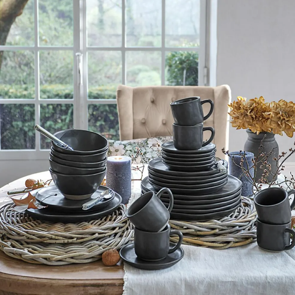 Ein reizendes, großes Set aus dreißig Teilen mit ganz ursprünglichem Charme. Bitte beachten Sie: Es handelt sich hierbei um einen Artikel 2. Wahl mit kleinen Produktionsfehlern, die jedoch die Funktion nicht beeinträchtigen und den individuellen Charakter des Sets unterstreichen. Jedes Set, sowie jedes einzelne Element kann in der Farbe anders ausfallen – mal dunkler, mal heller, mal mit etwas anderem Farbverlauf. Die gezeigten Bilder können daher durchaus stark von der Realität abweichen. Es sind eben einzigartige Unikate! Das schicke Geschirr ist bewusst uneben designt, was ihm eine handgemachte Anmutung gibt. Es besteht aus Steinzeug mit handgetöpferter Optik. Der Boden ist bei allen Elementen unglasiert. Besonders bei den Schüsseln ist das sehr gut zu sehen. Diese unbearbeitete Seite macht das ganze Set noch reizvoller. Diese natürliche, mediterrane Note sorgt für Urlaubsgefühle. Hiermit ist Ihre Tafel immer perfekt passend und harmonisch eingedeckt. Das große Set ist ideal für Mahlzeiten mit Freunden und Familie in geselliger Runde. Enthalten sind sechs Abendessenteller, sechs Beilagenteller, sechs Tassen, sechs Unterteller und sechs Schüsseln. Vom Kaffee am Morgen bis zu Brunch und Frühstück, einem leichten Salat am Mittag, Obst und Käse als Snack, Kaffee und Kuchen am Nachmittag bis hin zum Dinner am Abend sind Sie hiermit bestens ausgestattet. Kleinere Sets dieses hochwertigen Geschirrs, wie zum Beispiel ein Set aus sechs Tellern oder ein Set aus sechs Tassen samt Untertassen, können Sie ebenfalls separat hier im Shop bestellen. Suchen Sie einfach nach unserer Biarré-Geschirrreihe. Wir wünschen guten Appetit.