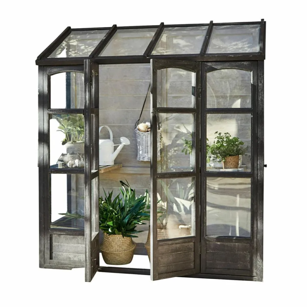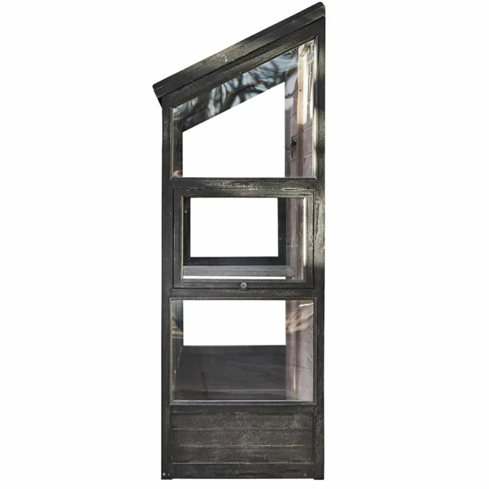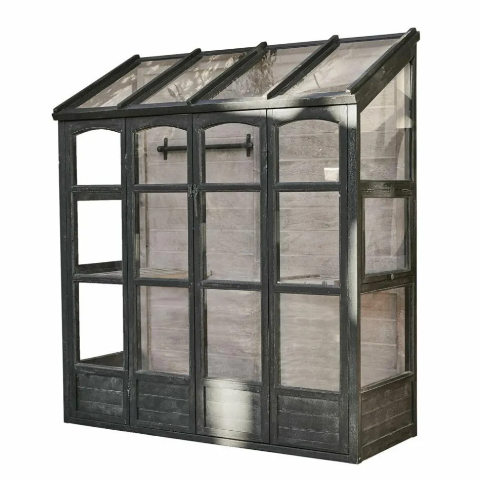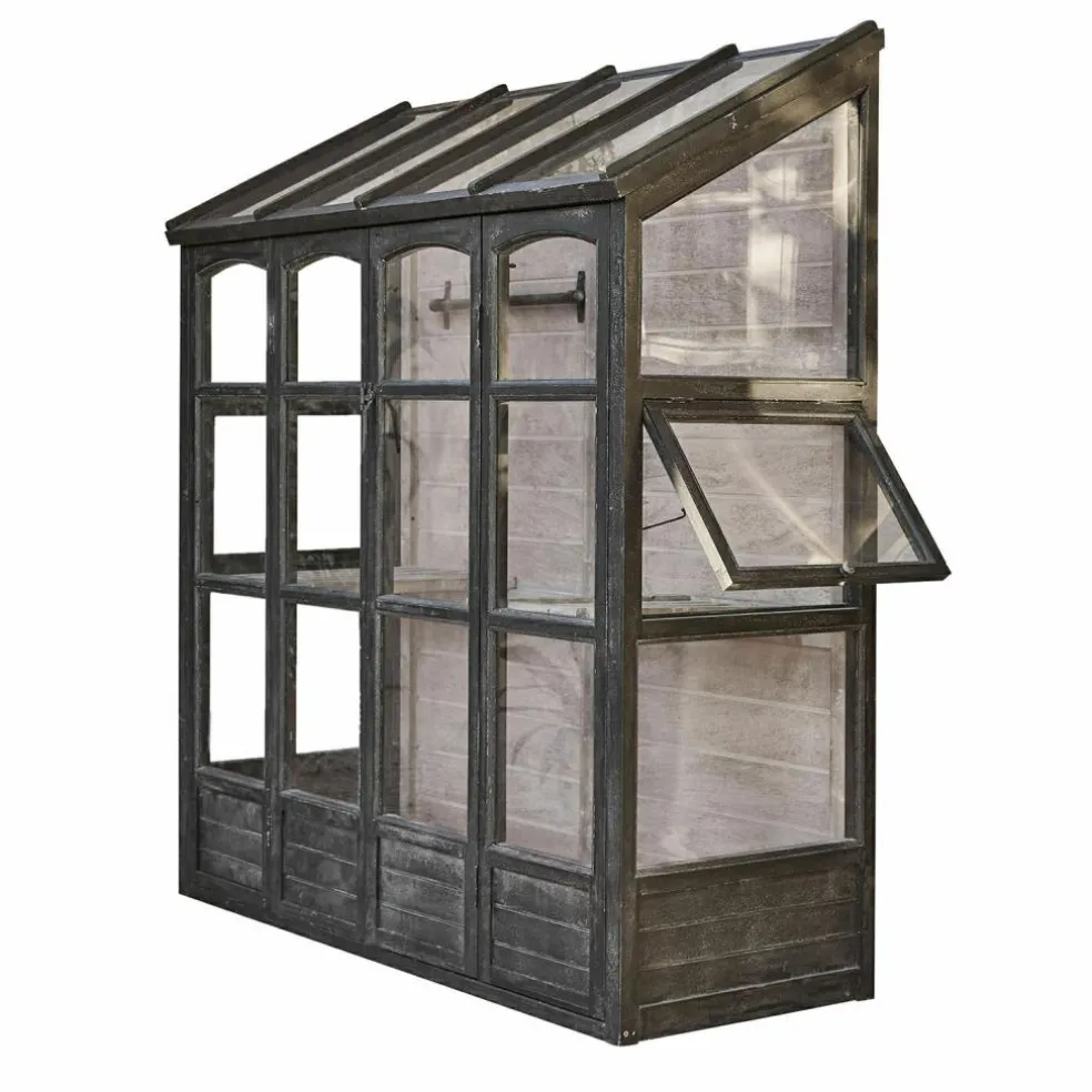 Aromatisches Basilikum und sonnengereifte Tomaten für Insalata Caprese ernten, die Salatpflänzchen umtopfen, die Sie nächste Woche ernten möchten und dann noch schnell die prachtvollen Sommerblumen gießen, die bald ins Gartenbeet umziehen dürfen – mit diesem Gewächshaus bekommt Ihr Hobby Gärtnern eine ganz neue Qualität. Und Ihr Garten wird um ein Schmuckstück reicher, das das unnachahmliche Flair englischer Cottage-Gärten verbreitet, wo das Ziehen von Gemüse und Blumen in einem glasshouse seit Jahrhunderten Tradition ist. Mit seiner stabilen Sprossenfenster-Konstruktion aus Kiefernholz und dem antikschwarzen Finish erinnert das Gewächshaus an die berühmten viktorianischen Vorbilder aus Eisen und bildet einen stilvollen Rahmen für den lichtdurchfluteten Innenraum. Die Fenster sind bei diesem Gewächshaus mit robustem Acrylglas verglast, das ausreichend Sonne und Licht ins Innere fallen lässt, damit sich Ihre Pflanzenschützlinge rundum wohl fühlen und prächtig gedeihen. Auch das White-Washed-Finish im Inneren trägt zu der angenehmen Atmosphäre im Innenraum bei, während verschiedene Ablagen auch kleineren Pflanzen einen attraktiven Standplatz bieten.