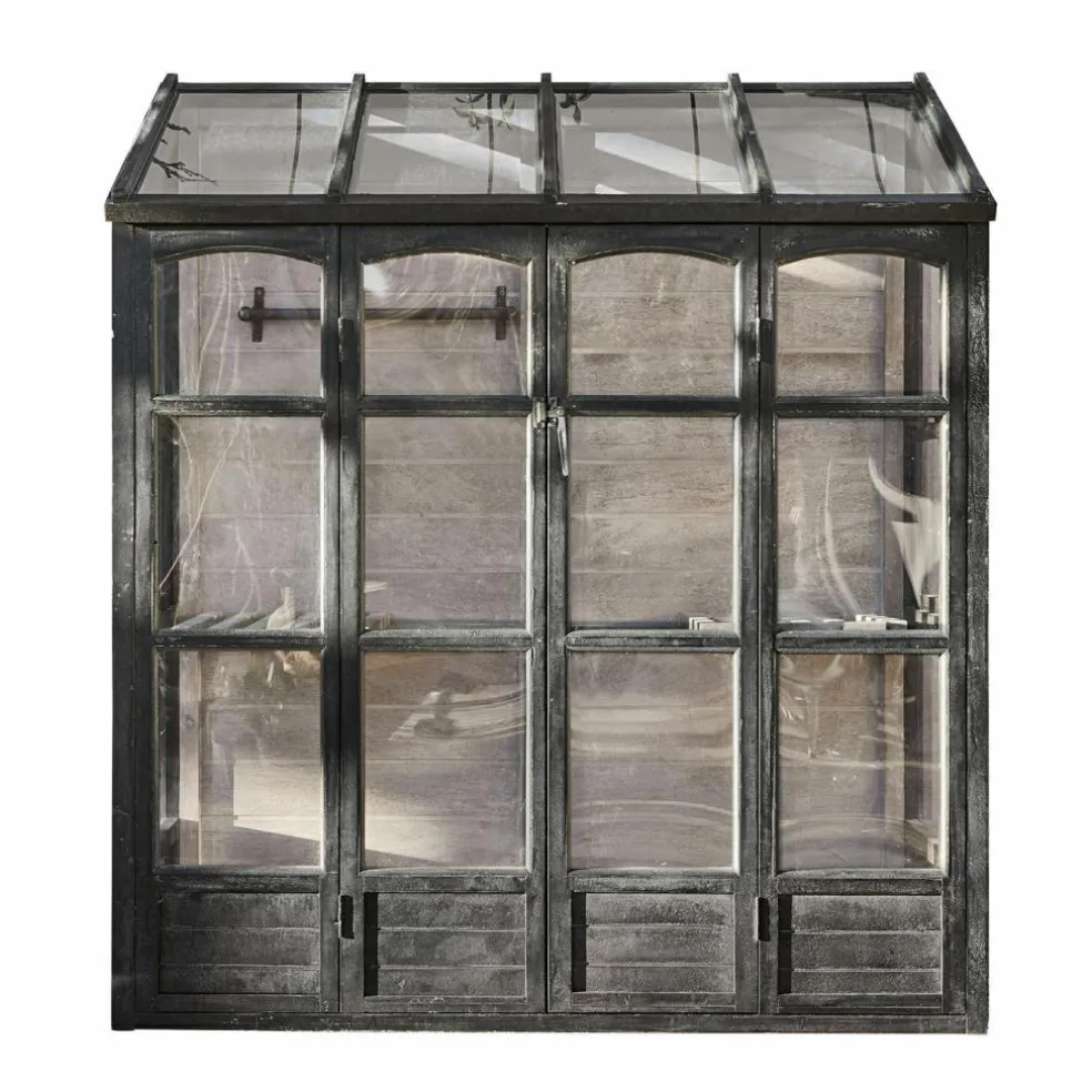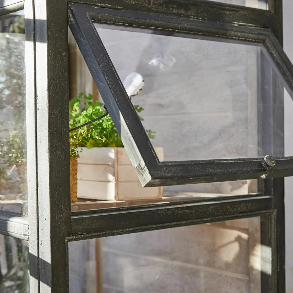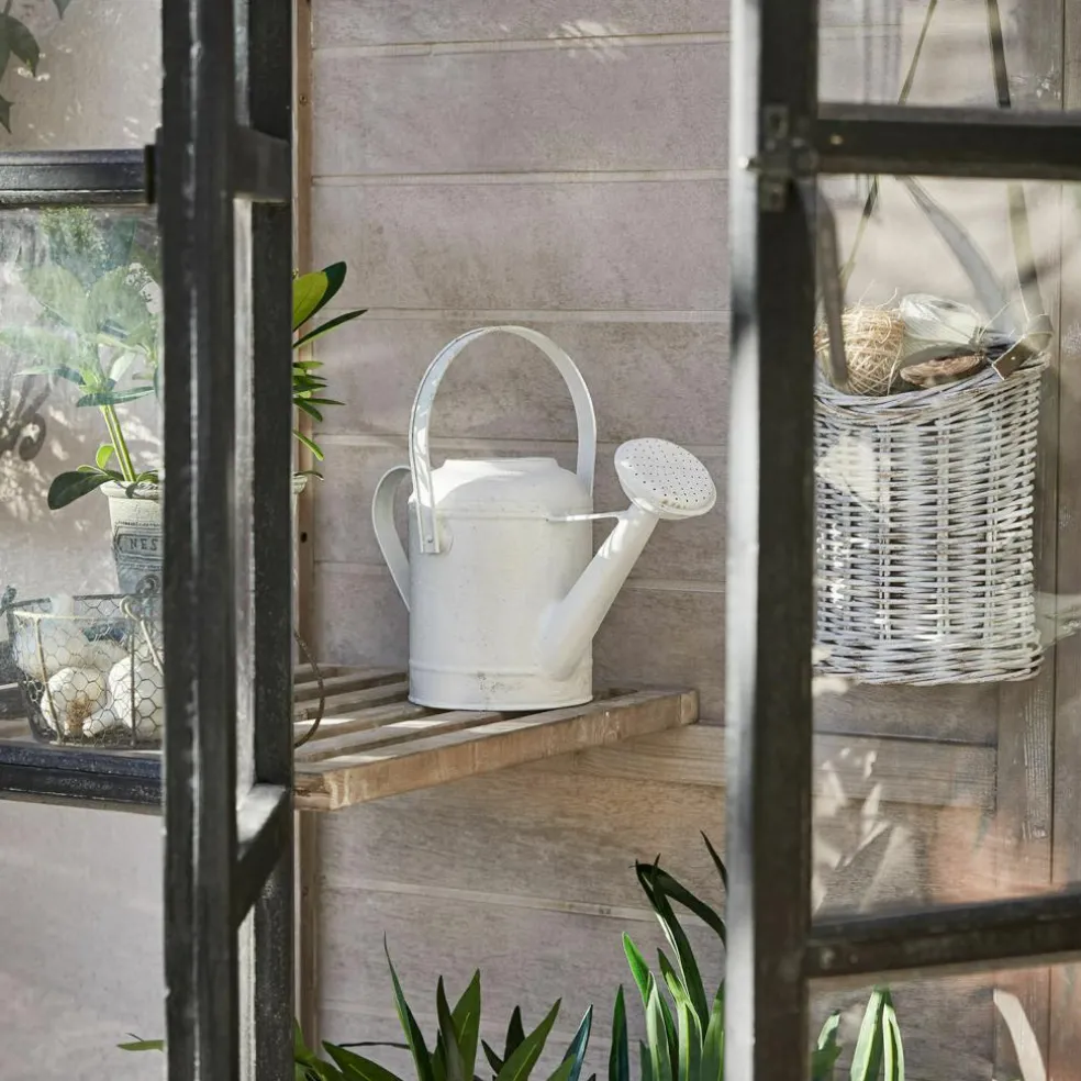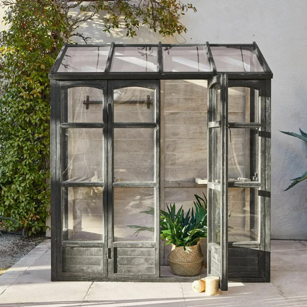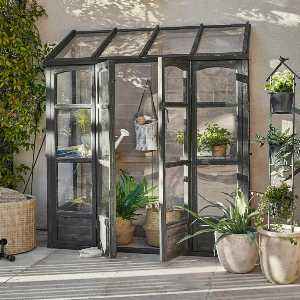 Aromatisches Basilikum und sonnengereifte Tomaten für Insalata Caprese ernten, die Salatpflänzchen umtopfen, die Sie nächste Woche ernten möchten und dann noch schnell die prachtvollen Sommerblumen gießen, die bald ins Gartenbeet umziehen dürfen – mit diesem Gewächshaus bekommt Ihr Hobby Gärtnern eine ganz neue Qualität. Und Ihr Garten wird um ein Schmuckstück reicher, das das unnachahmliche Flair englischer Cottage-Gärten verbreitet, wo das Ziehen von Gemüse und Blumen in einem glasshouse seit Jahrhunderten Tradition ist. Mit seiner stabilen Sprossenfenster-Konstruktion aus Kiefernholz und dem antikschwarzen Finish erinnert das Gewächshaus an die berühmten viktorianischen Vorbilder aus Eisen und bildet einen stilvollen Rahmen für den lichtdurchfluteten Innenraum. Die Fenster sind bei diesem Gewächshaus mit robustem Acrylglas verglast, das ausreichend Sonne und Licht ins Innere fallen lässt, damit sich Ihre Pflanzenschützlinge rundum wohl fühlen und prächtig gedeihen. Auch das White-Washed-Finish im Inneren trägt zu der angenehmen Atmosphäre im Innenraum bei, während verschiedene Ablagen auch kleineren Pflanzen einen attraktiven Standplatz bieten.