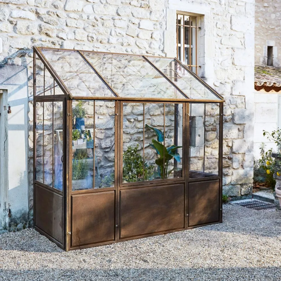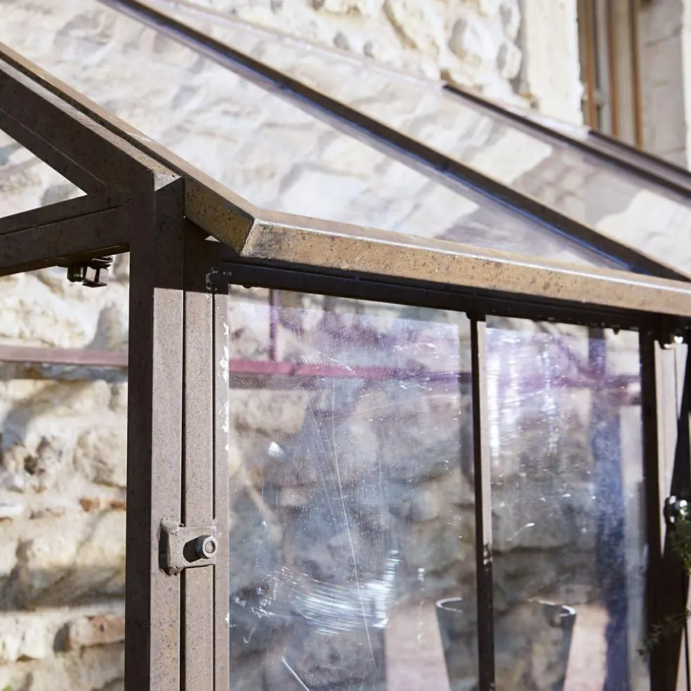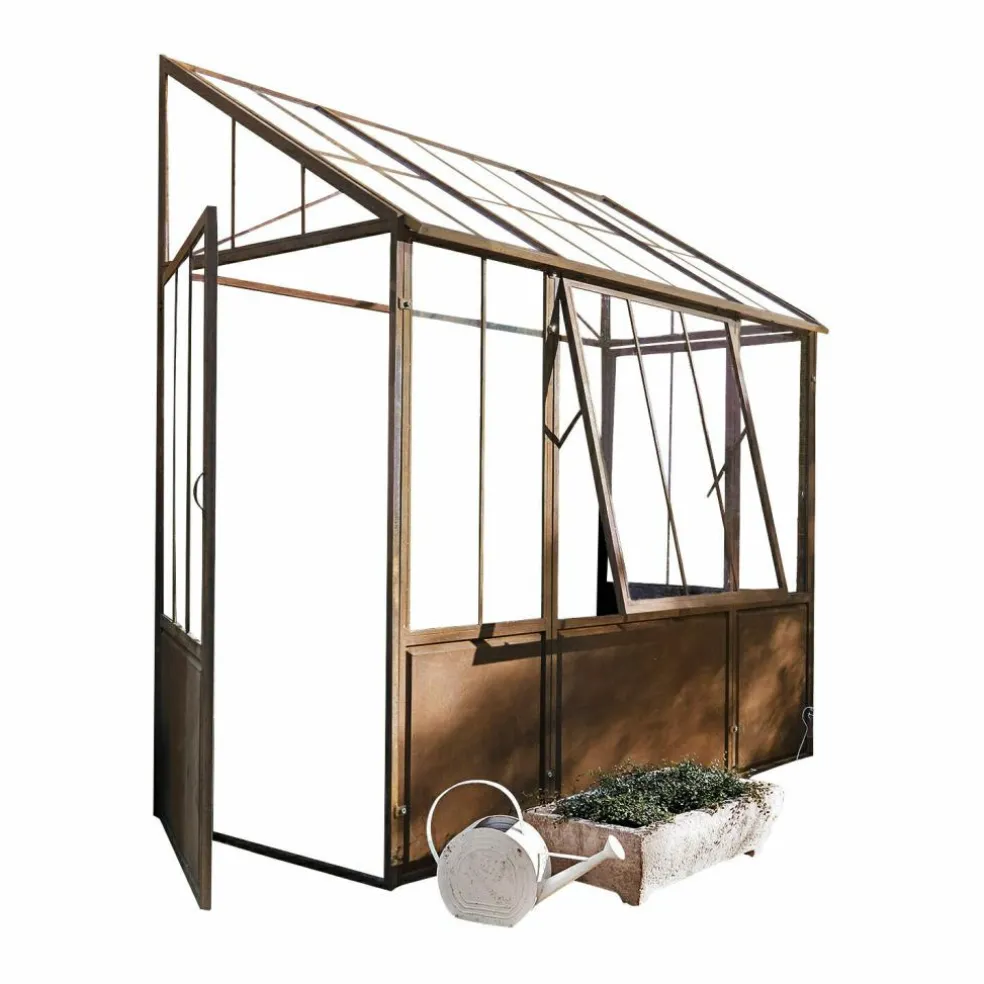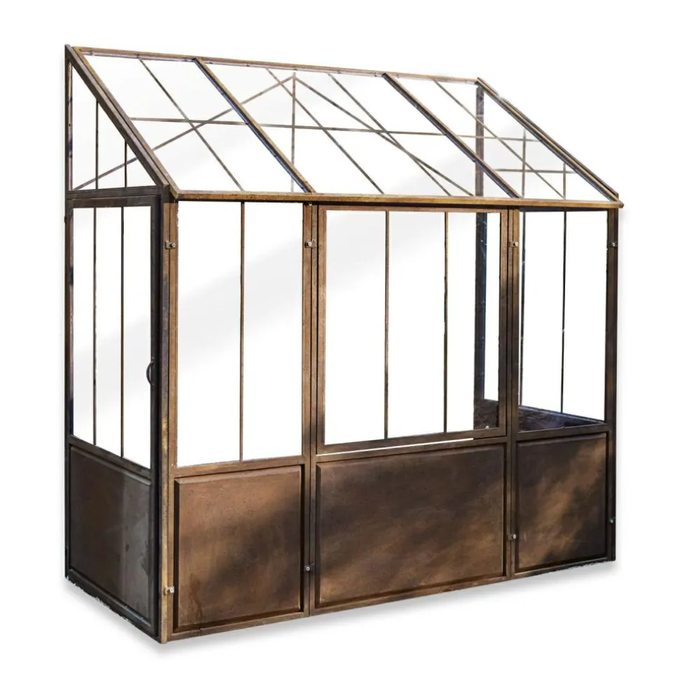 Dieses Gewächshaus wirkt durch sein authentisches Antik-Design absolut einzigartig. Die robuste Konstruktion ist darauf ausgelegt, an einer Wand positioniert zu werden und bietet selbst großen Baumgewächsen ausreichend Raum. Um Witterungsbeständigkeit zu gewährleisten, kommen bei der Herstellung ausschließlich Eisen und eine hochwertige Acrylverglasung zum Einsatz. Die besondere Material- und Herstellungsqualität machen das Gewächshaus absolut regenbeständig und frostresistent. Betreten lässt sich das Gewächshaus durch je eine seitlich angebrachte Tür. Für Belüftung sorgt ein großes Fenster, das sich von unten her kippen lässt. So bekommen Ihre Pflanzen auch immer ausreichend viel Luft und können in sicherer Umgebung bestens gedeihen.